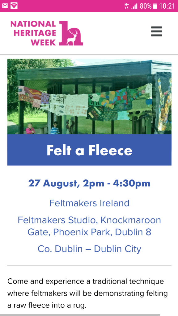 Heritage Week – Open Studio August 27th Published on Aug 3, 2017Apr 6, 2023 by Feltmakers Ireland Date for your Diary Share this:TweetLike Loading...