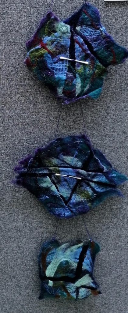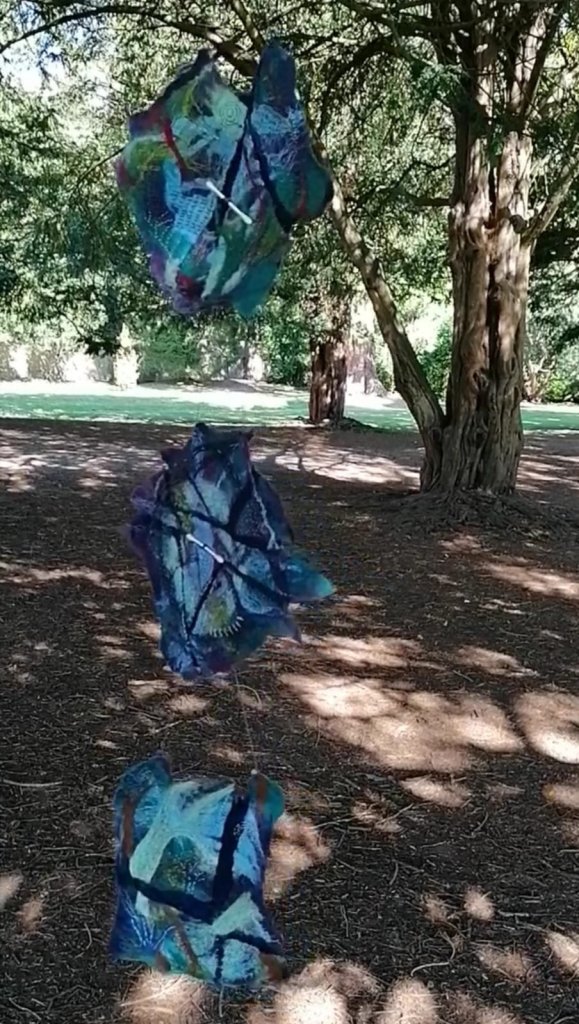 Ramona Farrelly joined feltmakers Ireland only last year. Thank you for being brave enough to enter your work in the exhibition. On the day we hung the exhibit, committee member Maria McGivern photographed some pieces outside. This piece looked beautiful, swaying in the breeze.
