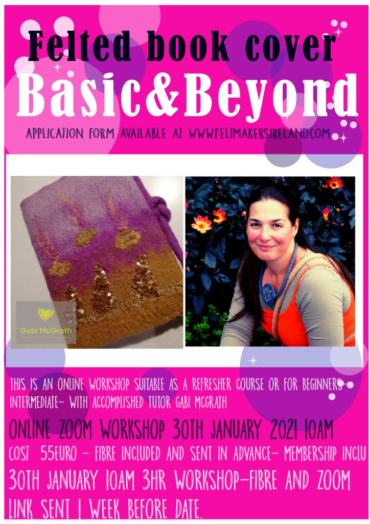 This is a workshop with tutor- Gabi McGrath, 3hrs long, starting at 10am. To make an A5 felted book cover. Your 100grm of fibre and cotton gauze is included in the price and will be sent out in advance. You will need to have downloaded the zoom platform as a link will be sent one week before.
