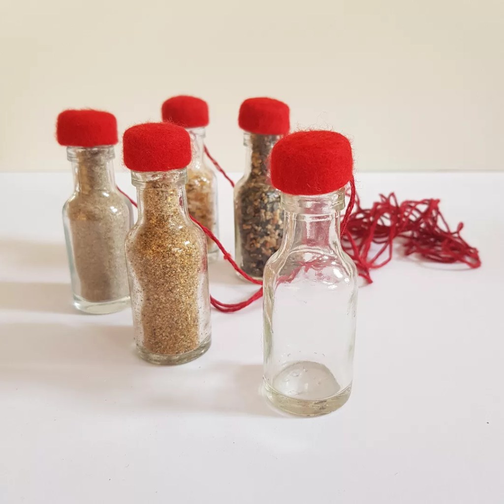 The materials used in my piece are fully sustainable. I have used repurposed glass bottles to contain sand ( from Irish beaches… also the component for making glass). The felt tops are 100% wool, from sheep, a fully sustainable, and biodegradable material and the fibre attaching each bottle is linen, plant based, water consumption friendly material.