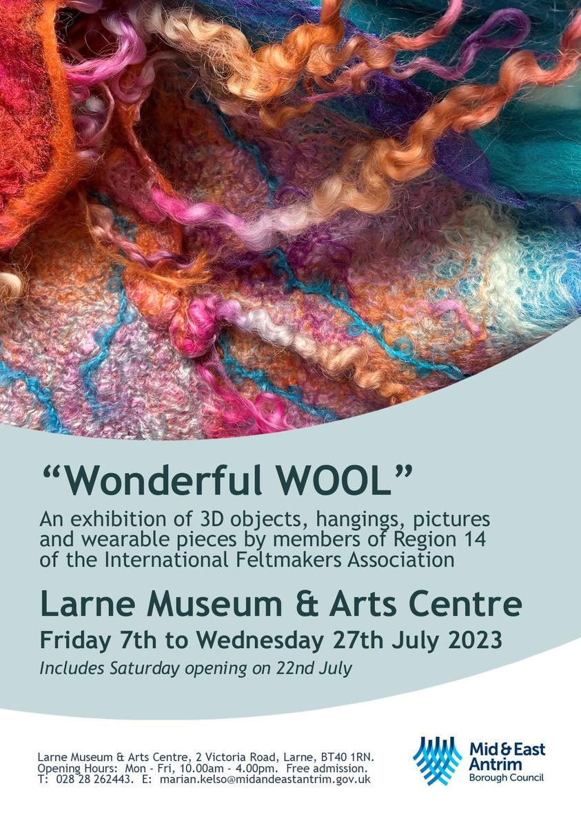 Several members of Feltmakers Ireland have pieces in the International Feltmakers Association – Region 14 members’ exhibition, ‘Wonderful WOOL’, set in the Larne Museum and Arts Centre, Larne, Co. Antrim, Northern Ireland, UK.