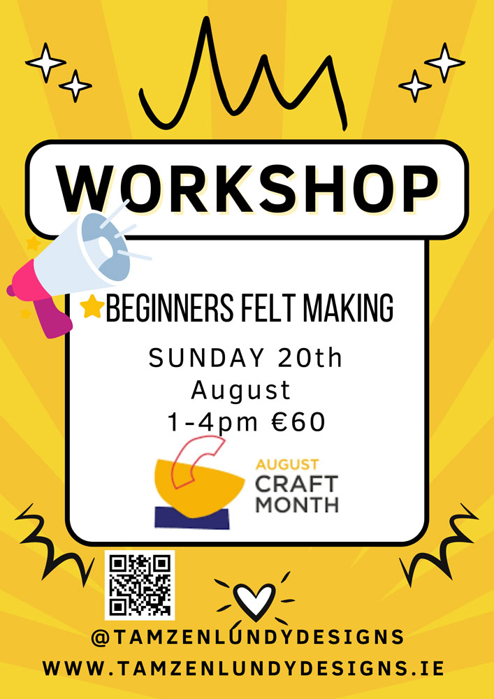 As part of August Craft Month, Feltmakers Ireland member Tamzen Lunday is teaching on Sunday, 20th August, from 1pm-4pm at the lovely studio and shop – Brookwood Pottery in Marino Mart, Fairview Dublin.