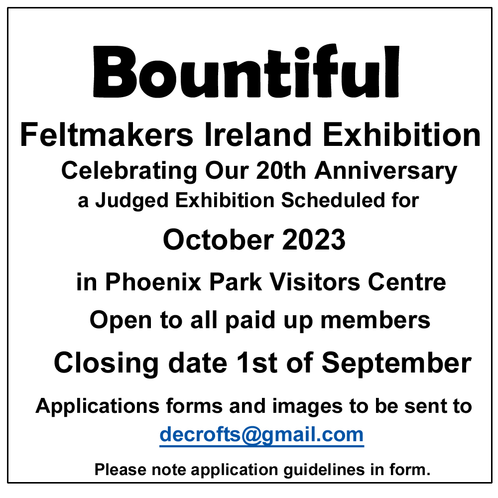 Paid-up members of Feltmakers Ireland are invited to apply to our annual juried exhibition in the Phoenix Park Visitors’ Centre. The theme is Bountiful, which you may interpret in any way that you wish.