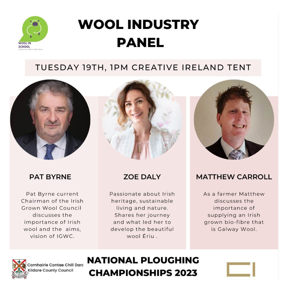 The panellists are Pat Byrne of the @irish_grown_wool_council_, Zoe Daly @eriu.ireland, and Matthew Carroll of @thegalwaywoolco_op.