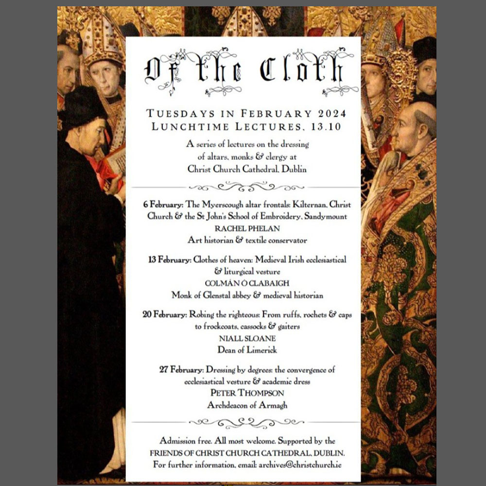 A series of free lunchtime lectures will be held at Christ Church, Dublin, this February 2024, on Tuesdays at 1:10pm. Entitled ‘Of the Cloth’, the series will examine all manner of ecclesiastical fabrics, from the dressing of altars, to the robing of monks and clergy.