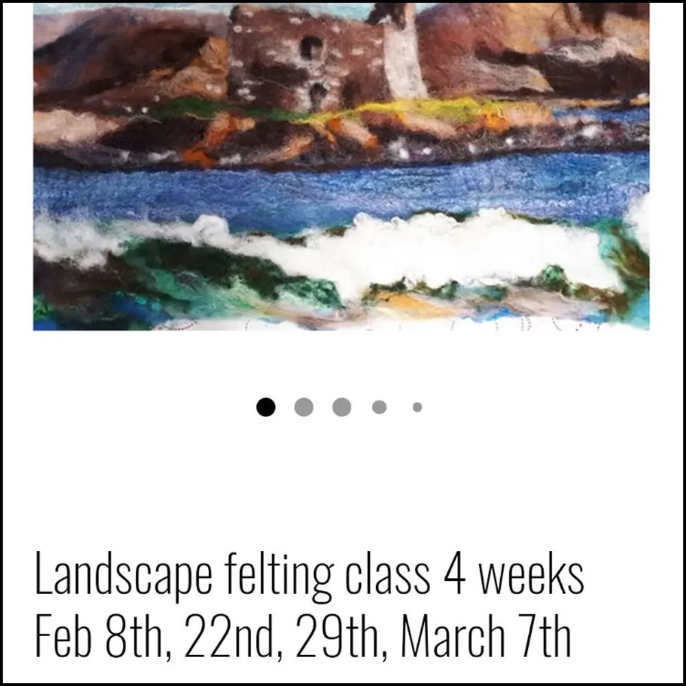 For more information, visit Sharon’s website – https://www.sharonwellsart.com/product-page/landscape-felting-class-4-weeks-feb-8th-22nd-29th-march-7th