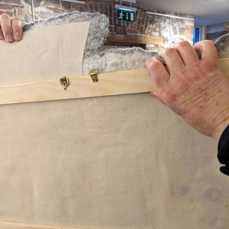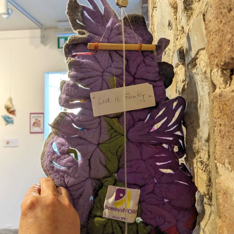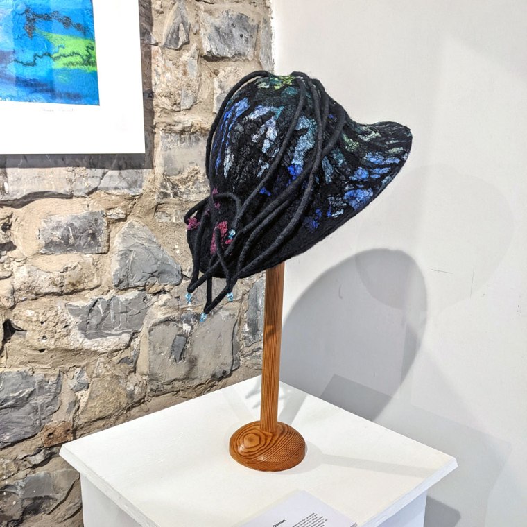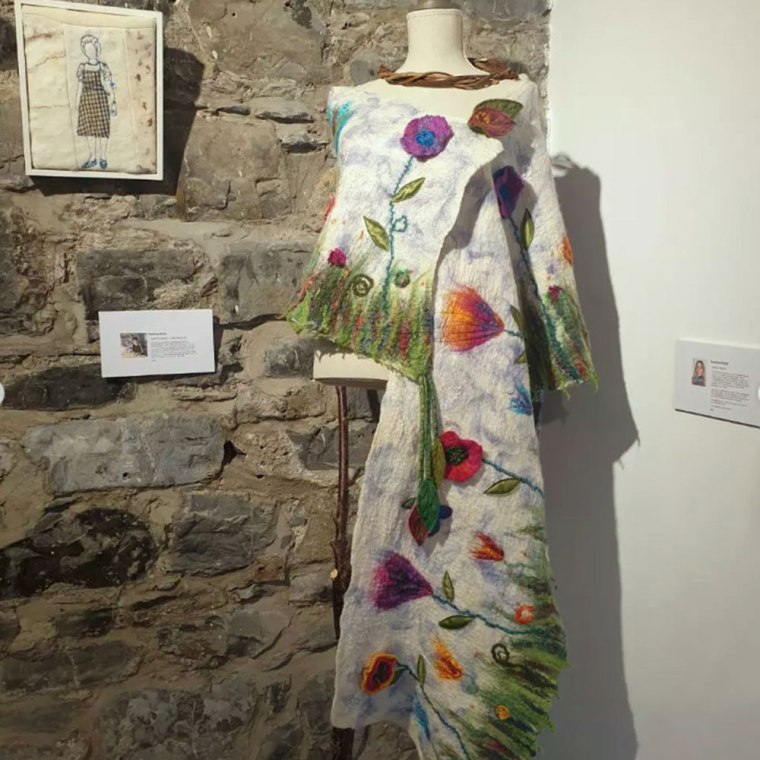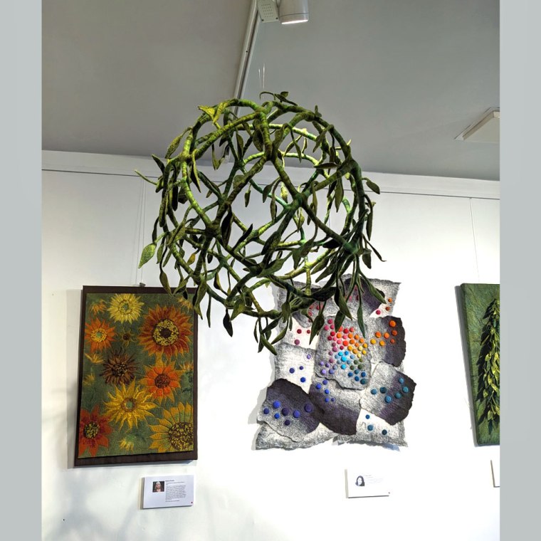 Most pieces in Feltmakers Ireland’s annual exhibition will be hung. The Phoenix Park Visitor Centre walls are made from attractive natural-coloured stone. Near the top of the gallery’s walls, there are wire devices with hooks suspended from a curtain rail. Exhibits can be attached at suitable intervals from this.