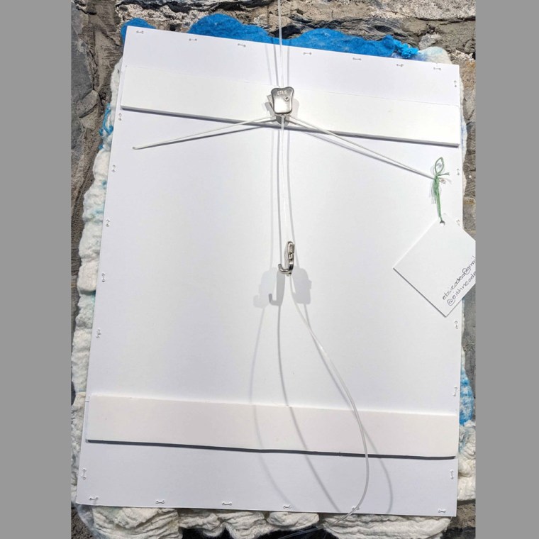 Many artworks are not framed—some are kept in shape with battens 1″ x 1″, e.g., in a square behind the felted item. The battens may be nailed in place with small panel pins. A hook can be attached to the top batten for hanging. Alternatively, firm calico fabric, just a tiny bit smaller than the piece, can be hand-stitched to the piece. Then, the battens can be glued to the calico – e.g. with strong spray glue. Another option is to use iron-on, double-sided, adhesive Bondaweb to connect your project to a backing fabric. Again, a hook should be attached. {Please do not use spray glue directly on your felted textile as it may damage it.}