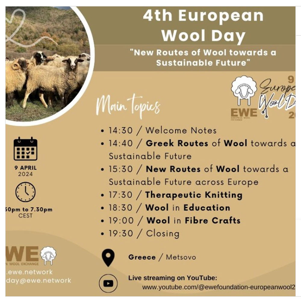 The Fourth Annual European Wool Day will be held in Greece on April 9th, from 2:30 to 7:30 Central European Time. This year’s theme is ‘New Routes of Wool towards a Sustainable Future’.