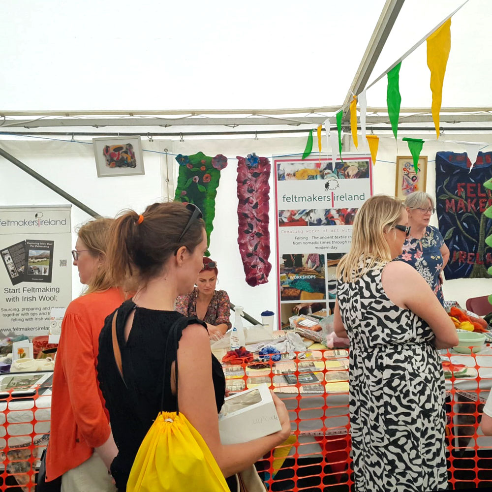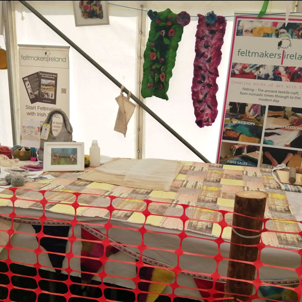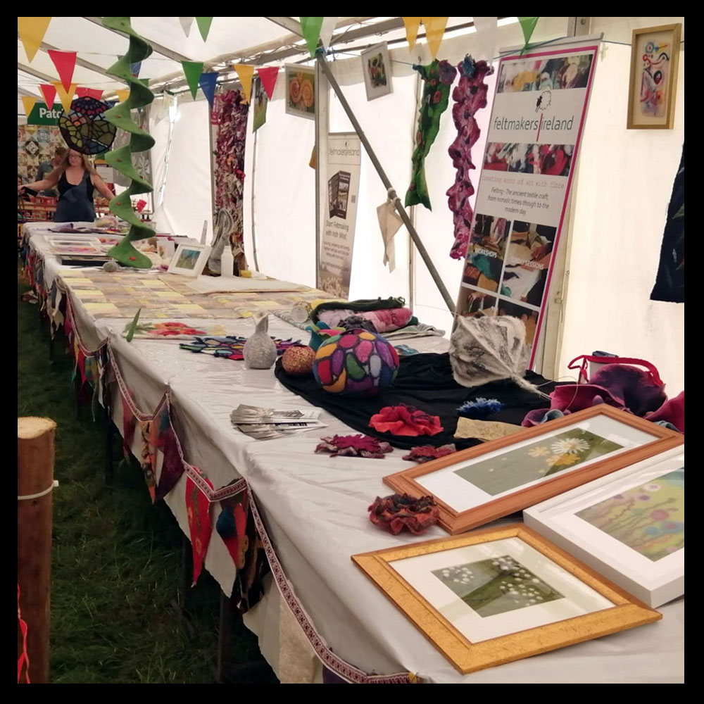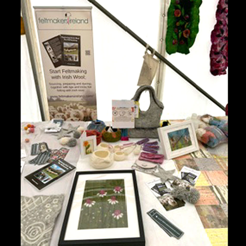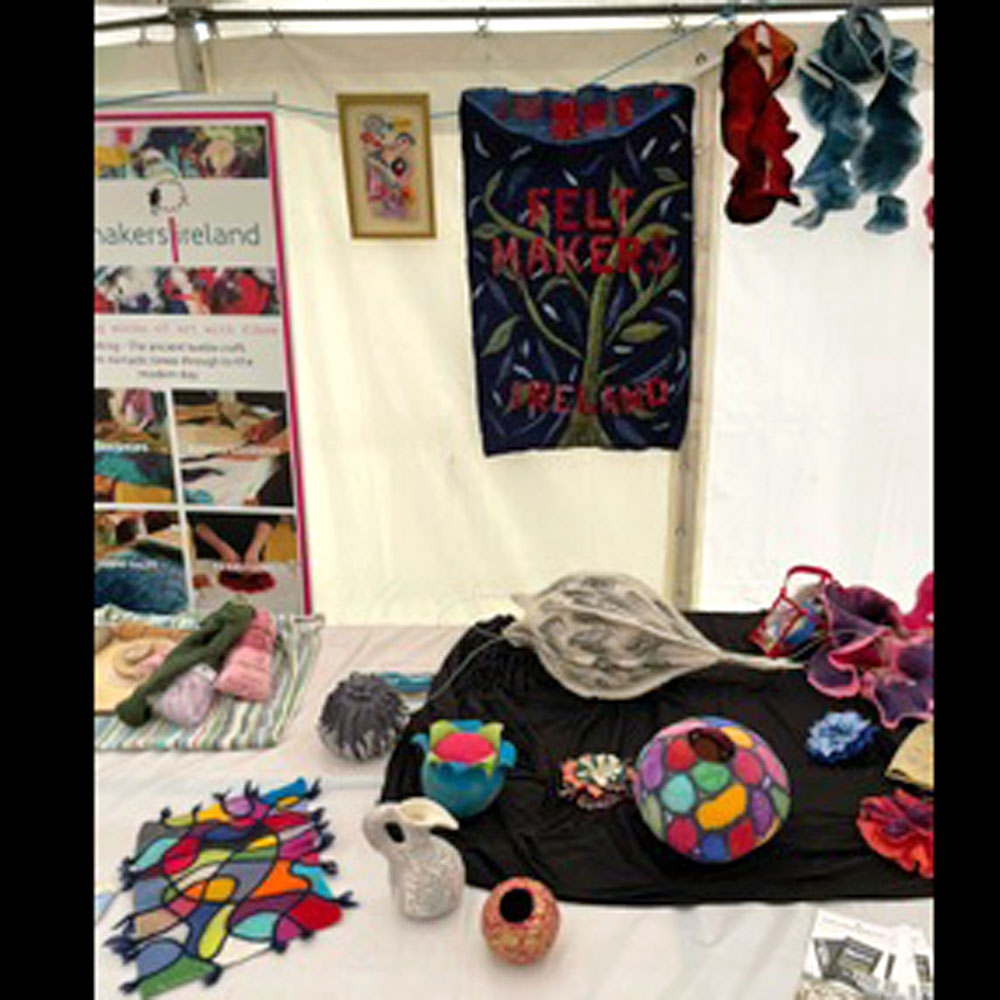 Feltmakers Ireland was delighted to be afforded a 12 m (approx) stand in the Craft and Needlework Marquee. Here, we displayed a wide variety of quality felted items, large and small. During the day, we demonstrated how felting is achieved, both wet felting and needle felting; we discussed its history, its wonder and magic, its sustainable elements, our wonderfully informative book ‘Exploring Irish Wool For Feltmaking ‘, the guild itself, and many more topics. Visitors got to touch and feel the wool fibre and the completed felt and asked a wonderful variety of questions.