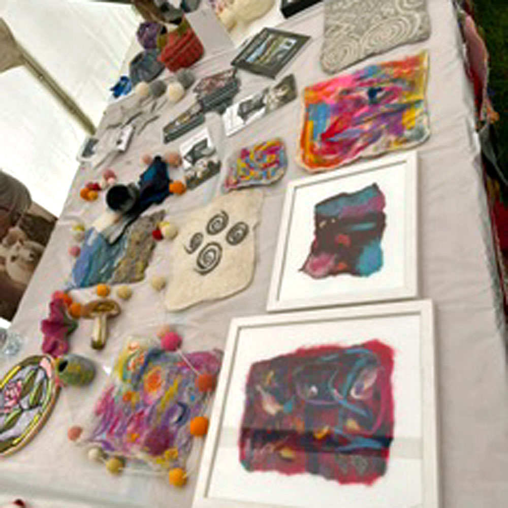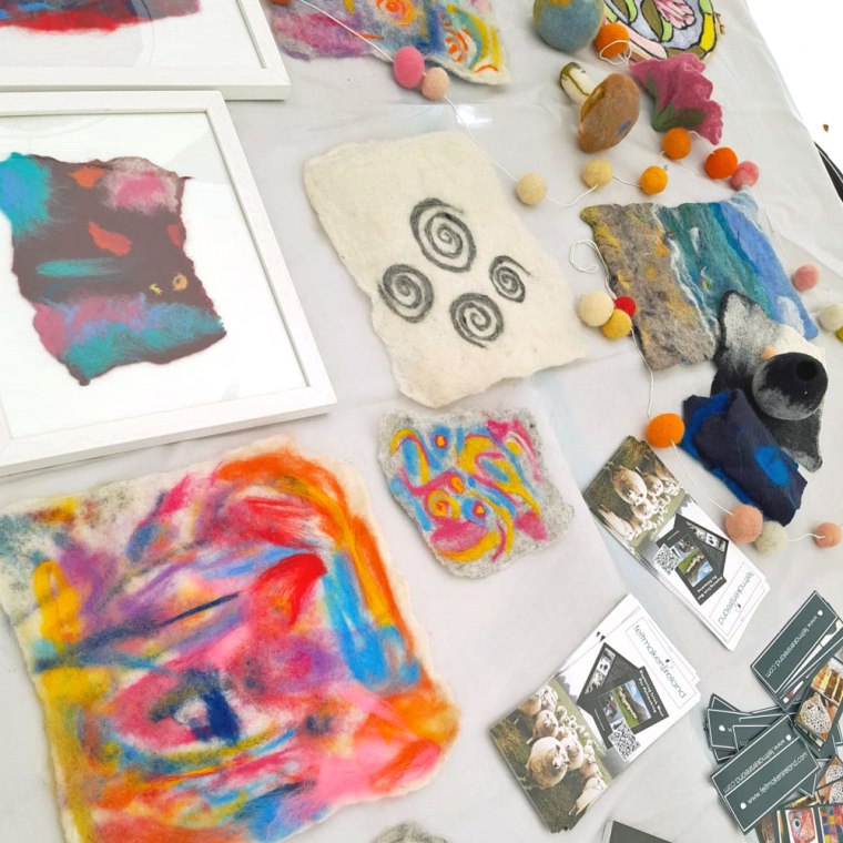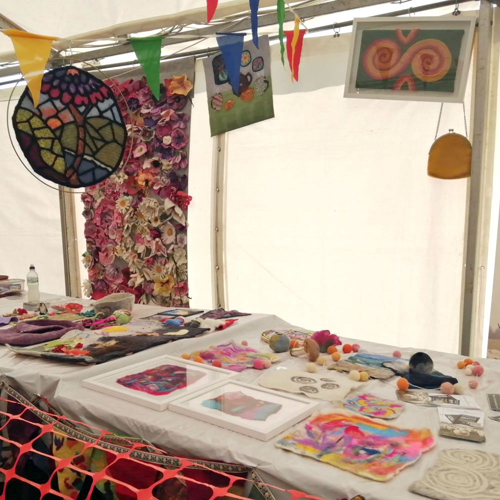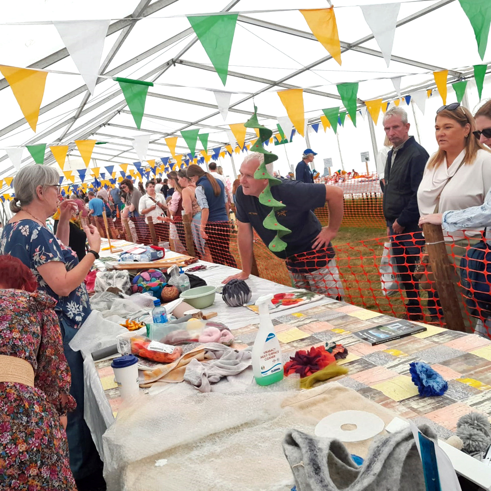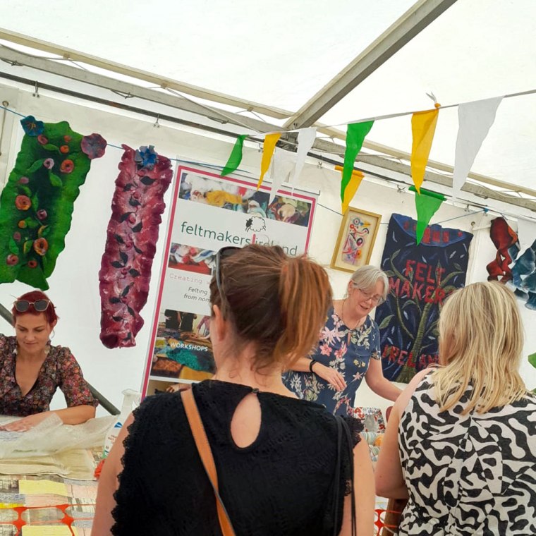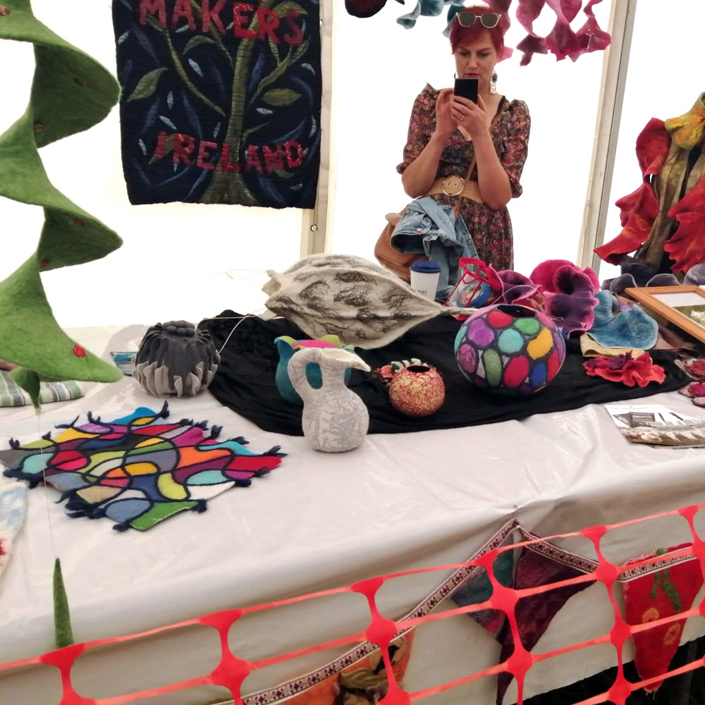 Feltmakers Ireland was delighted to be afforded a 12 m (approx) stand in the Craft and Needlework Marquee. Here, we displayed a wide variety of quality felted items, large and small. During the day, we demonstrated how felting is achieved, both wet felting and needle felting; we discussed its history, its wonder and magic, its sustainable elements, our wonderfully informative book ‘Exploring Irish Wool For Feltmaking ‘, the guild itself, and many more topics. Visitors got to touch and feel the wool fibre and the completed felt and asked a wonderful variety of questions.