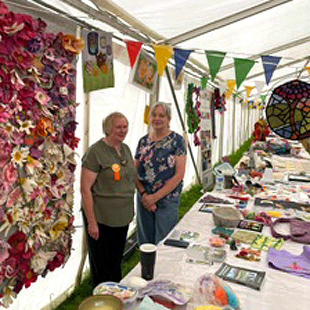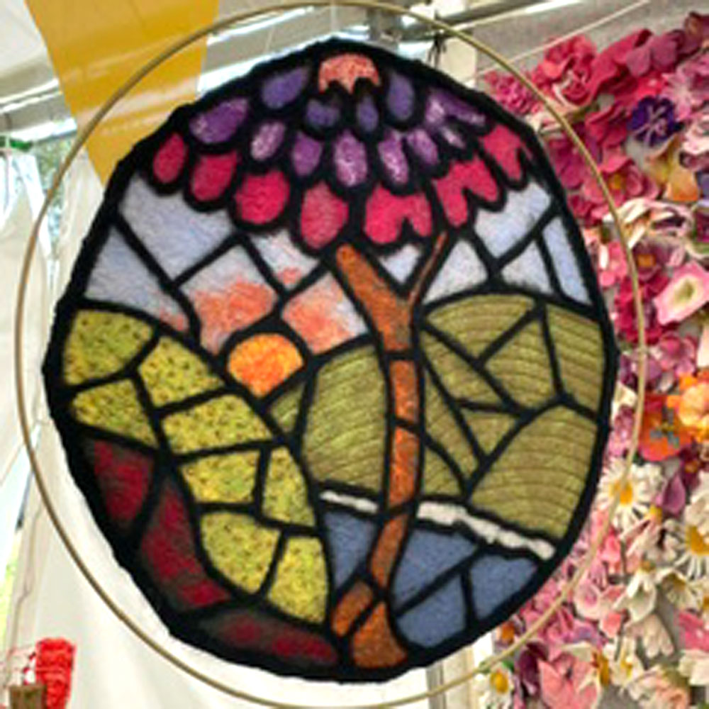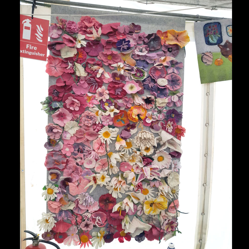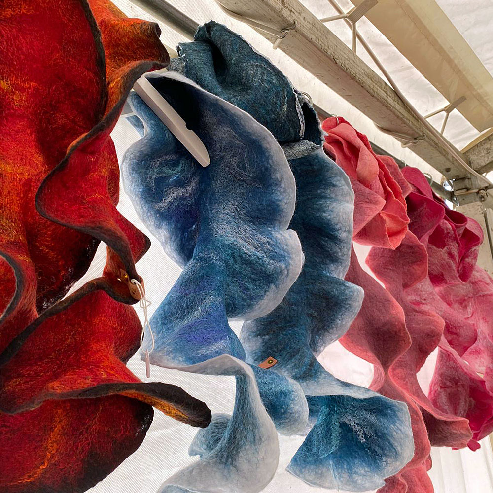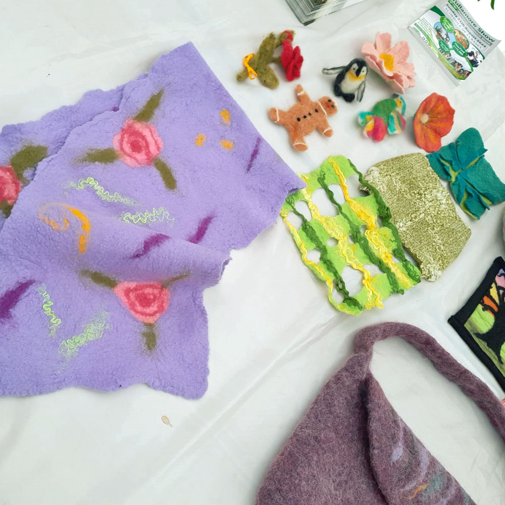 Feltmakers Ireland was delighted to be afforded a 12 m (approx) stand in the Craft and Needlework Marquee. Here, we displayed a wide variety of quality felted items, large and small. During the day, we demonstrated how felting is achieved, both wet felting and needle felting; we discussed its history, its wonder and magic, its sustainable elements, our wonderfully informative book ‘Exploring Irish Wool For Feltmaking ‘, the guild itself, and many more topics. Visitors got to touch and feel the wool fibre and the completed felt and asked a wonderful variety of questions.