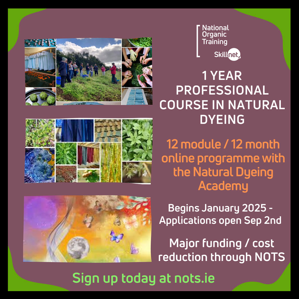 National Organic Training Skills (NOTS) is partnering with The Natural Dyers and Growers Academy and AppleOak FibreWorks to offer all Irish residents a 40% discount on the Natural Dyeying Course 2025 fees and a further 10% reduction on the dye and fabric boxes for the year.