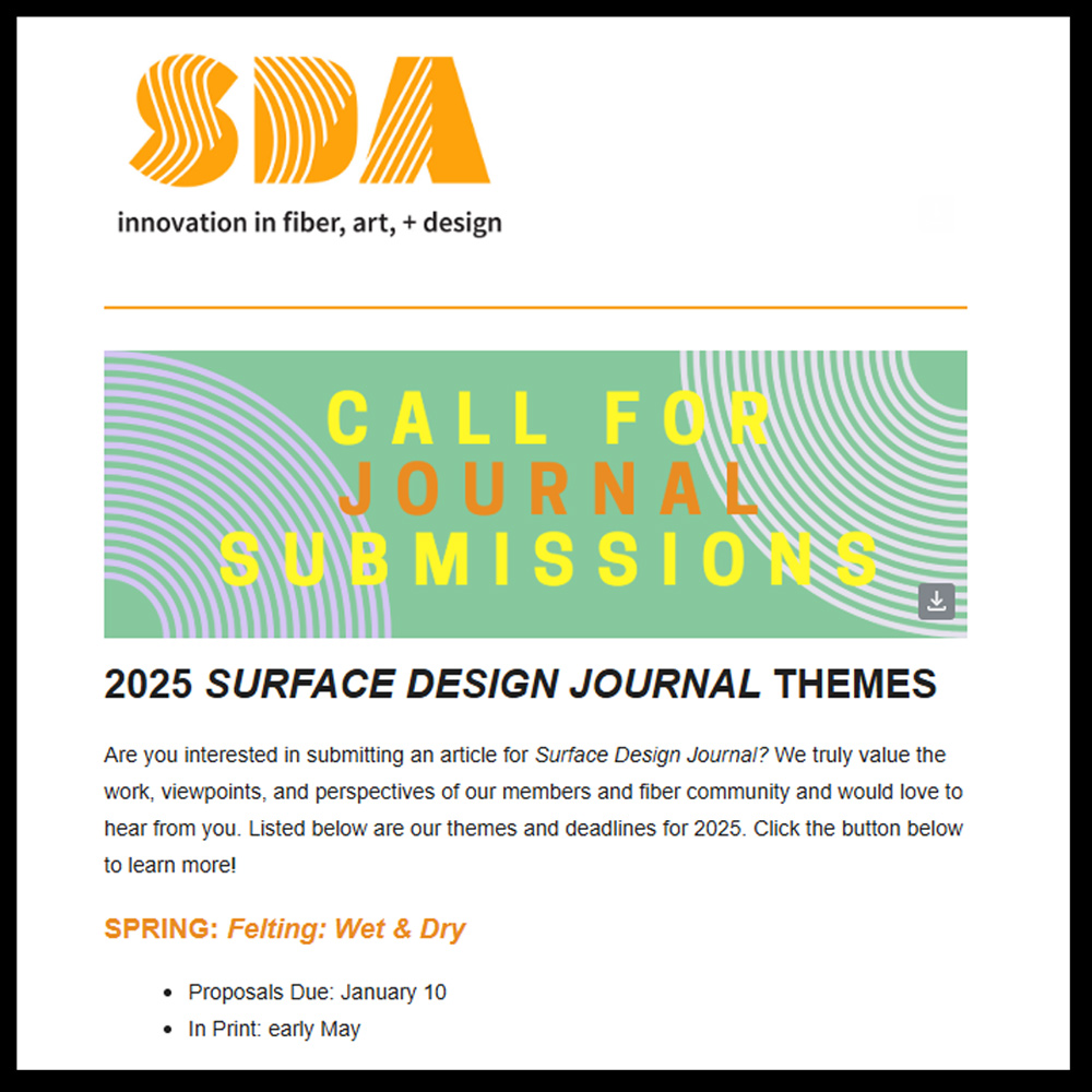 Learn more about journal submissions here on the SDA’s website – https://www.surfacedesign.org/journal/journal-submissions/