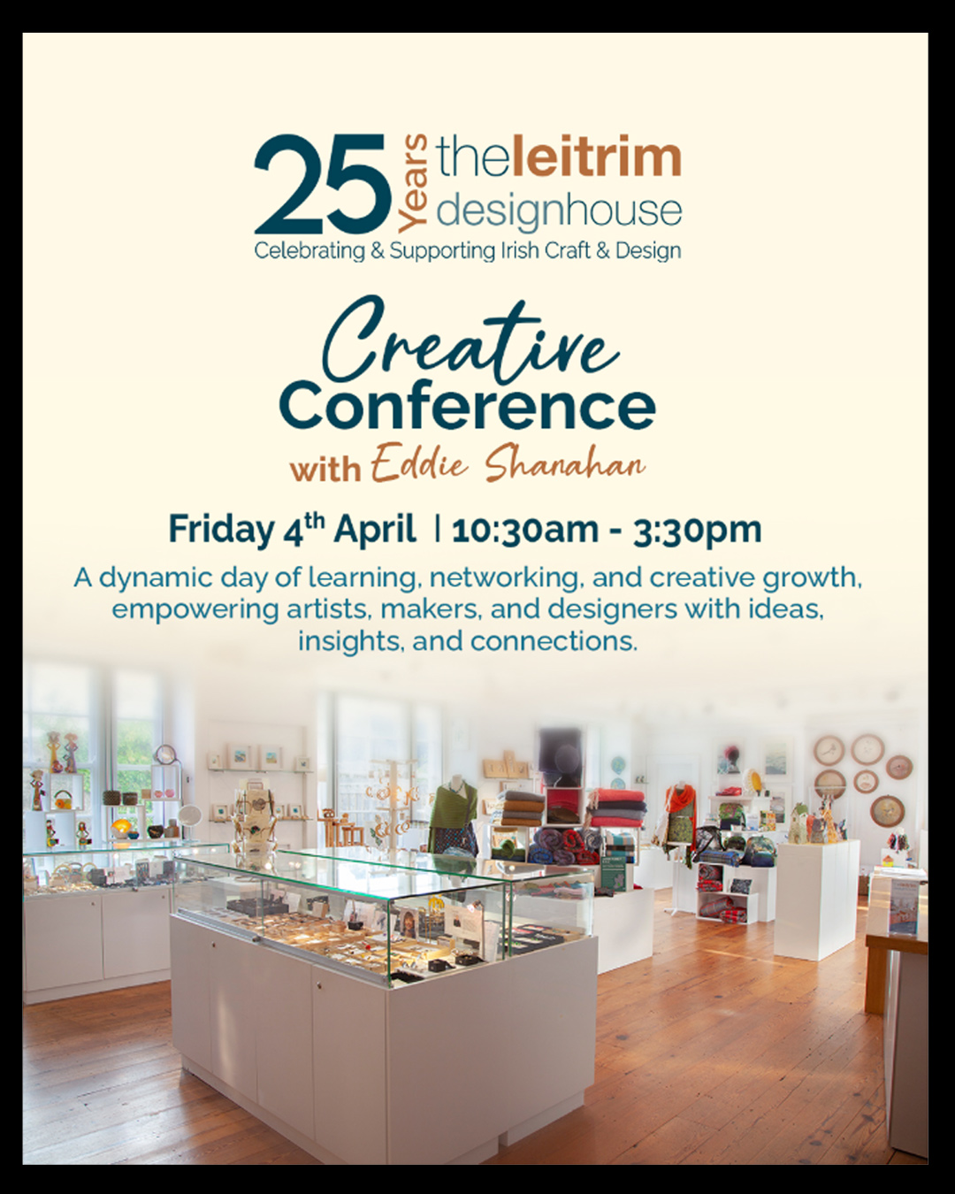 On Friday, the 4th of April, Eddie Shanahan will facilitate the Leitrim Design House Creative Conference. The day will include a motivational presentation for artists, crafters, and designers, a breakout clinic with guest speakers, a panel discussion, the Leitrim Design House National Awards launch, and a light lunch.