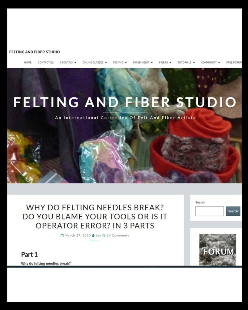 The writer, Jan, is a Canadian member of the Felting and Fiber Studio organisation and an experienced three-dimensional needle felter. Each instalment is interesting, and Jan is a thorough researcher, perceptive maker, and humorous writer. And don’t mind her spelling—she is severely dyslexic. She says on her bio page, “If you read out loud, I make more sense.” And she does!