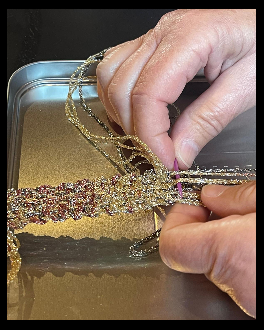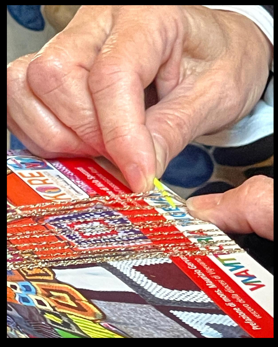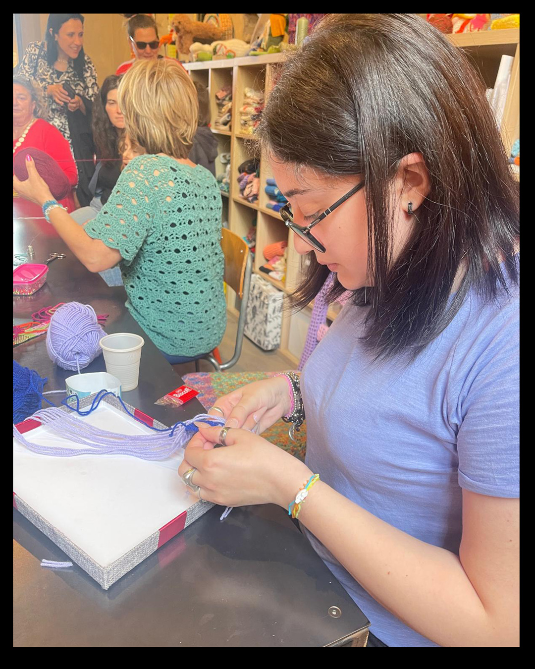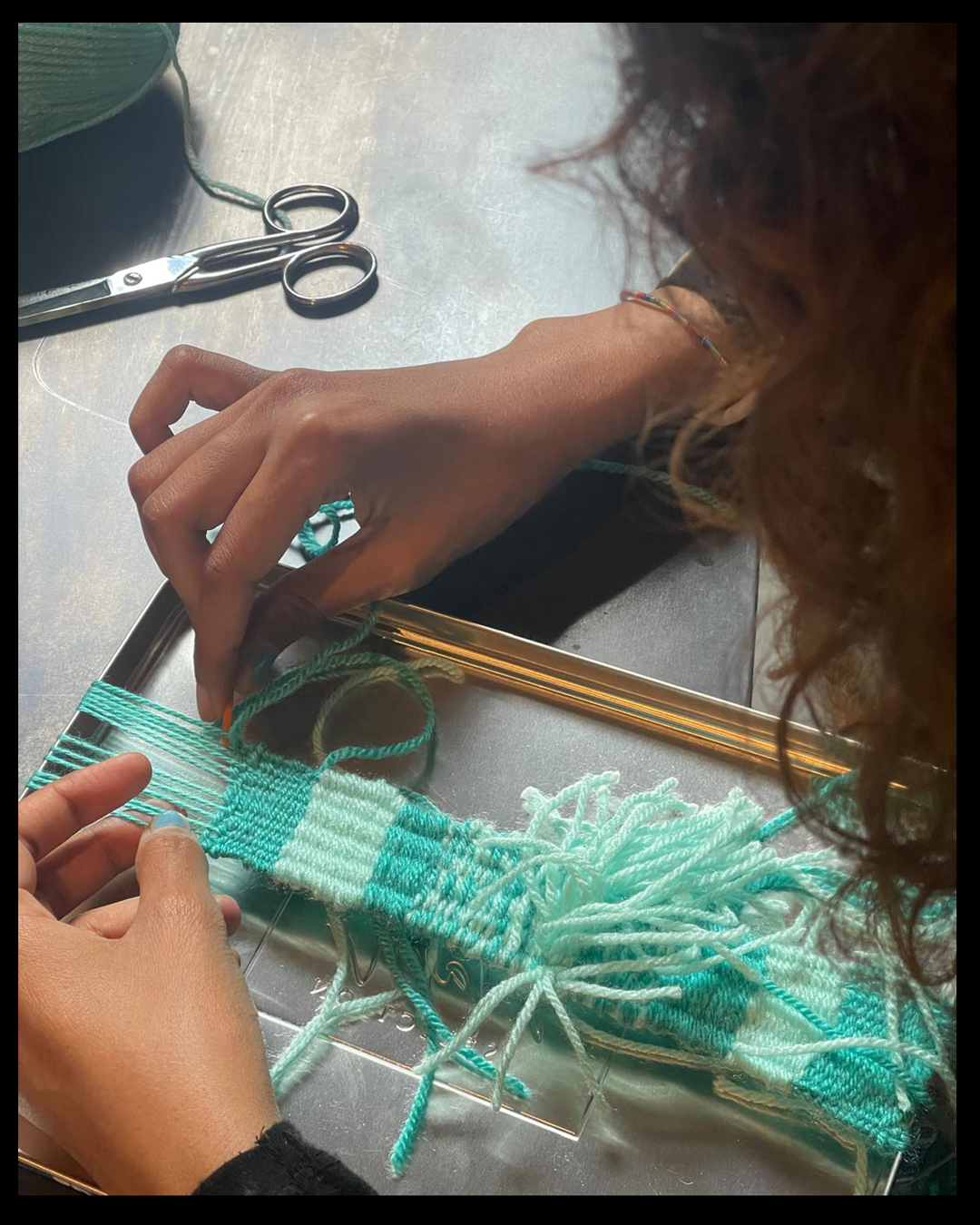 So you can understand why we felt a responsibility to do our bit. Margaret and Mary Ivell were able to be taught, or should I say, revive the skills from childhood, with the patient and expert guidance of the volunteers, and were soon on their way to creating a square. I, on the other hand, well, perimenopause, despite the HRT, has left my brain at a disadvantage. It’s basically on a go-slow, and I embarrassingly couldn’t grasp the basics. But I couldn’t just sit there and twiddle my thumbs, so the next day, even with a language barrier, I decided to teach hand weaving to anyone who wanted to learn. We improvised using books or box lids as mini looms, and over the six three-hour sessions, I passed on the craft to over a dozen women and girls. Using photos of my college work to show what could be achieved using the same techniques and stitches, and also using materials I’d sourced locally, such as magnetic fasteners, we made woven jewellery. By the end of our time, some of the volunteers I had taught were passing on the craft to others.