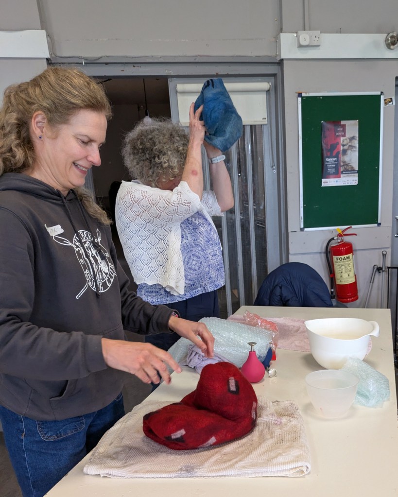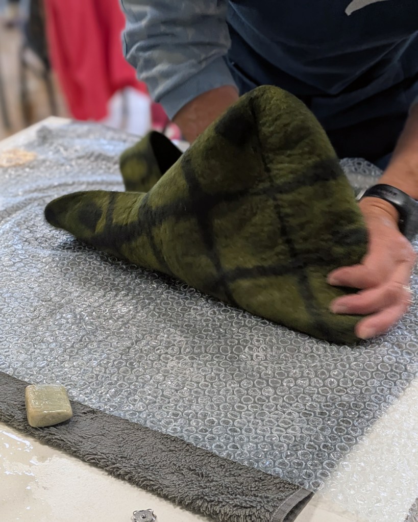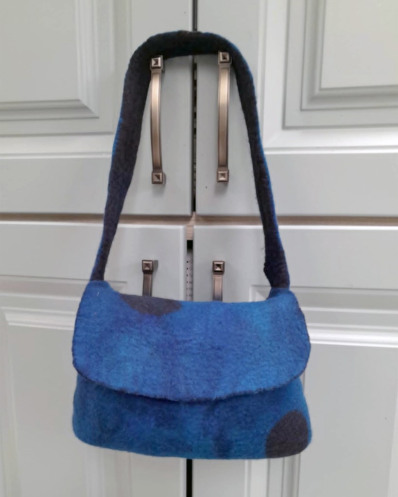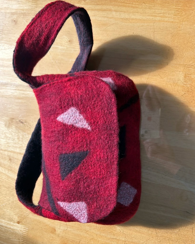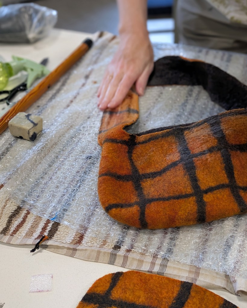 We had much to accomplish within one day—laying out fibre, rubbing, rolling, fulling, shaping, and transforming the wool roving into stylish, one-of-a-kind bags with a flap, strap, and pocket!