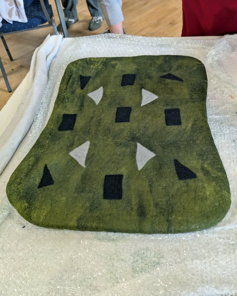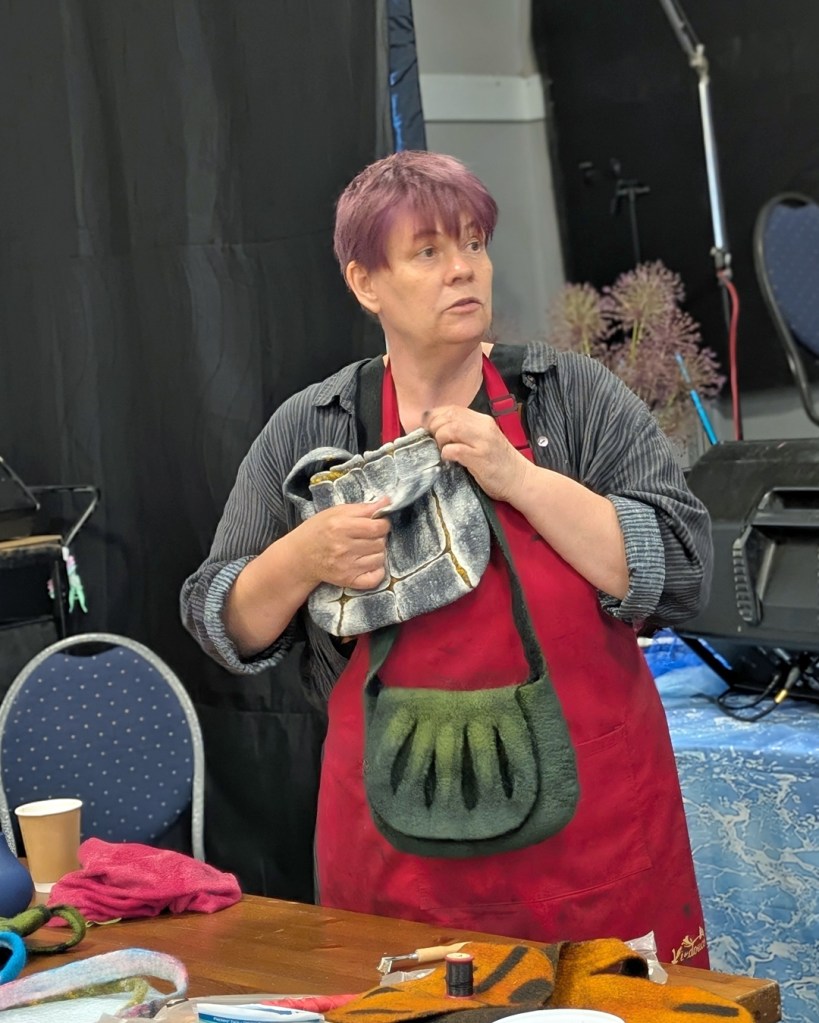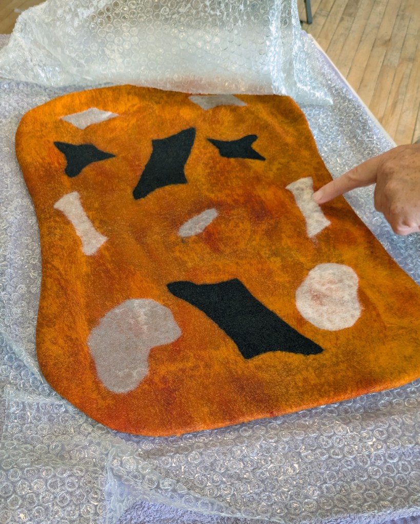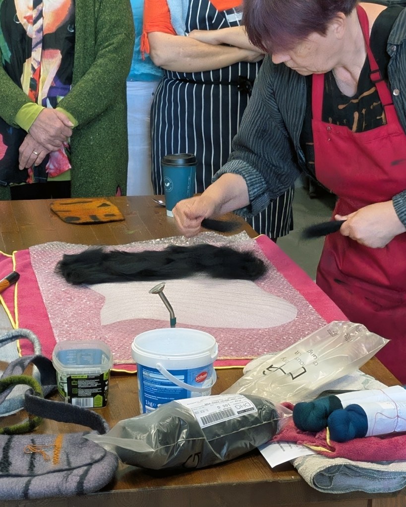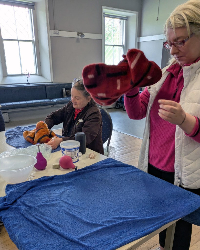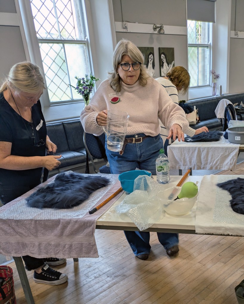 We had much to accomplish within one day—laying out fibre, rubbing, rolling, fulling, shaping, and transforming the wool roving into stylish, one-of-a-kind bags with a flap, strap, and pocket!