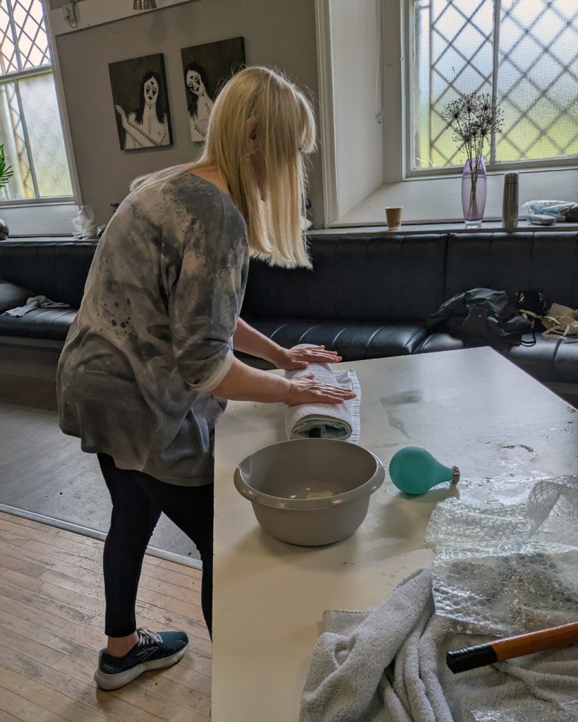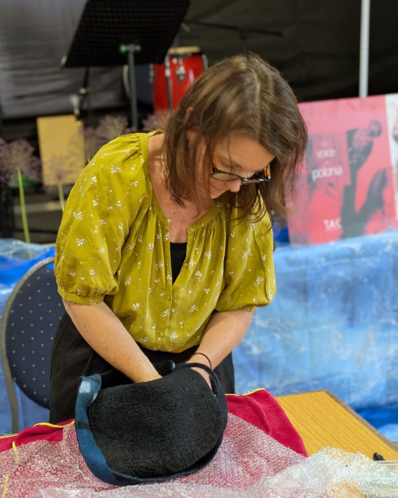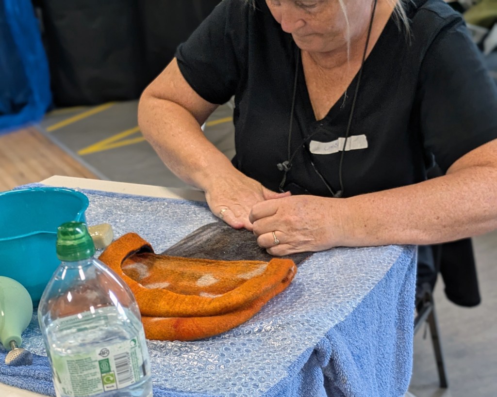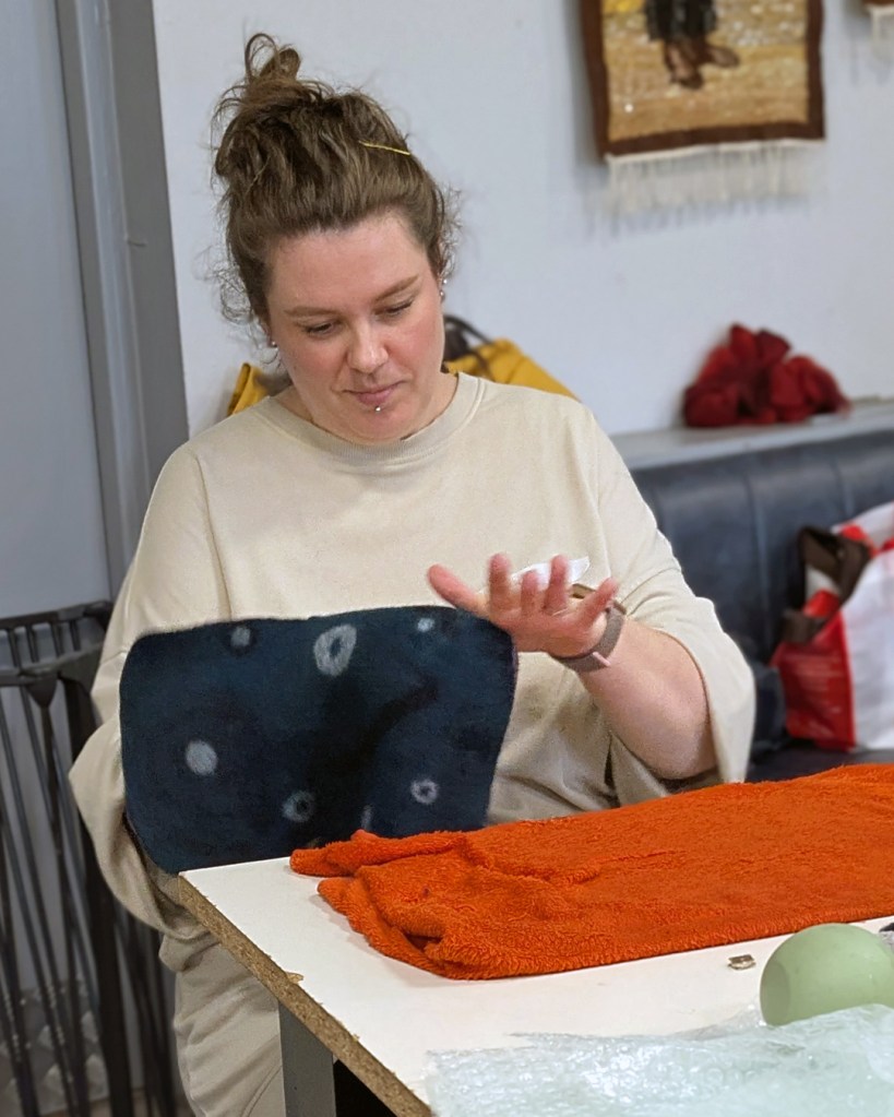 After layering the black and coloured wool around a resist, the students began the feltmaking process: Rubbing, rolling, massaging, and throwing.