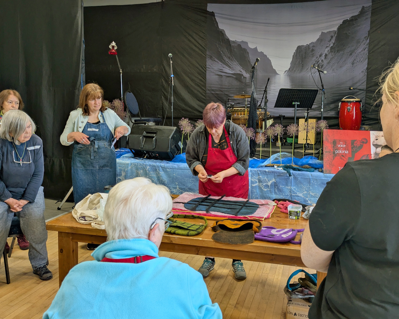 Special thanks to our helpers, Dee, Fiona, Sam, Suzanne, and Juliane, who helped the students, filled up water containers, mopped the puddles, and served the cake. Also, special thanks to committee members (and Bag Making students) Adrienne, who helped sign in the attendees, and Lorna, who made the Burco work.