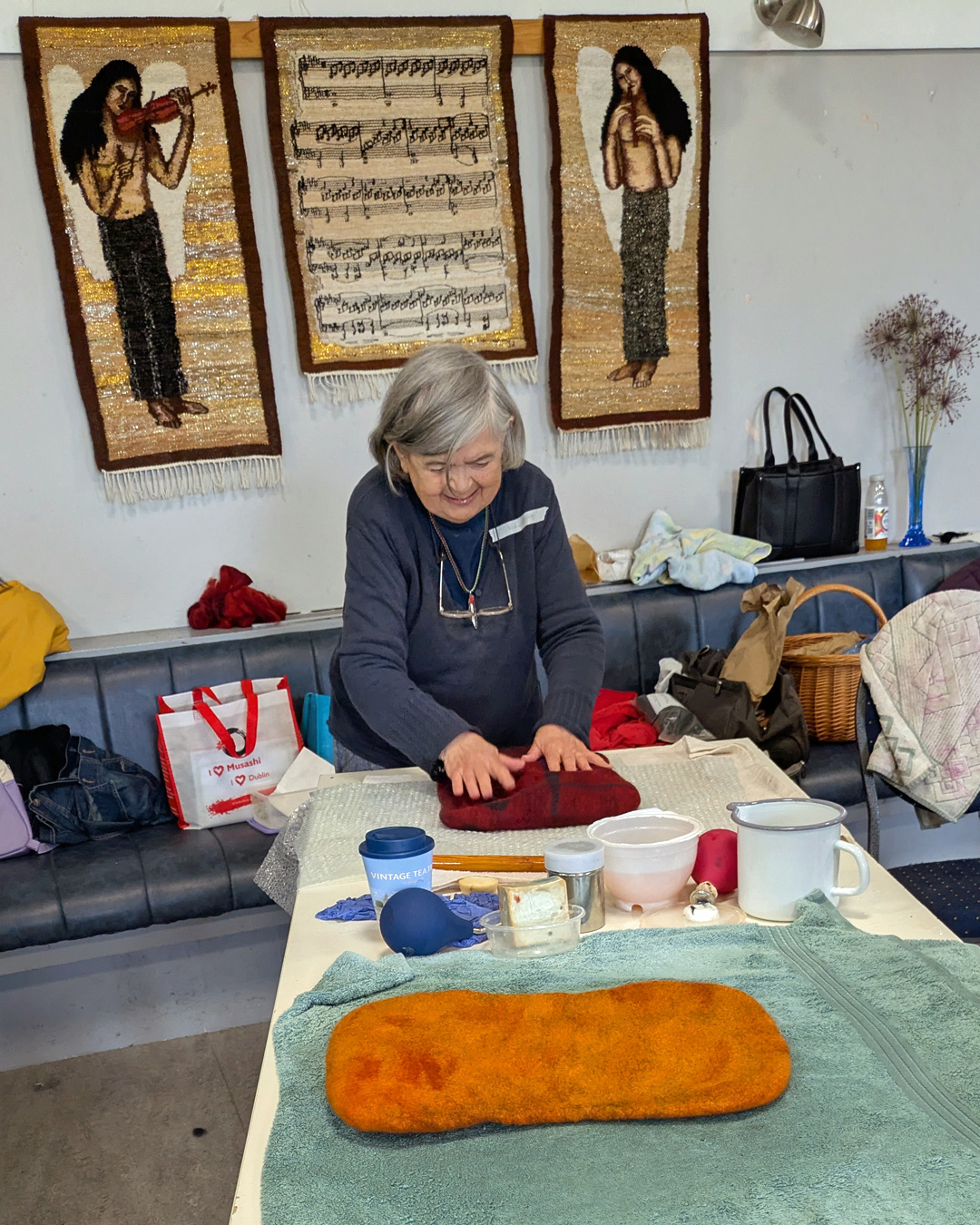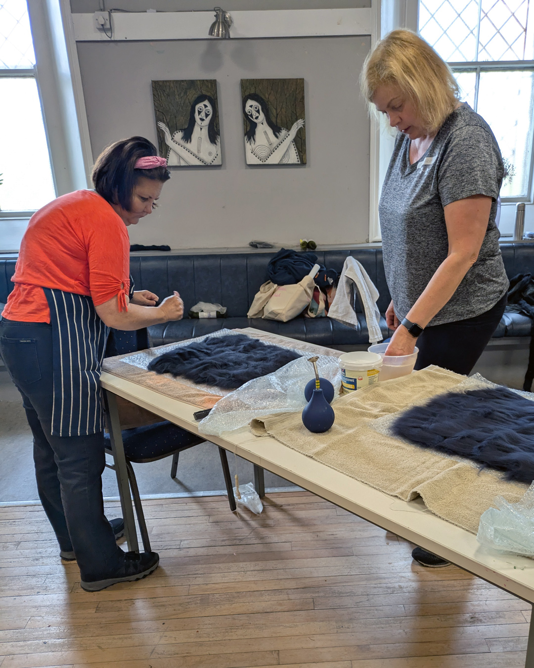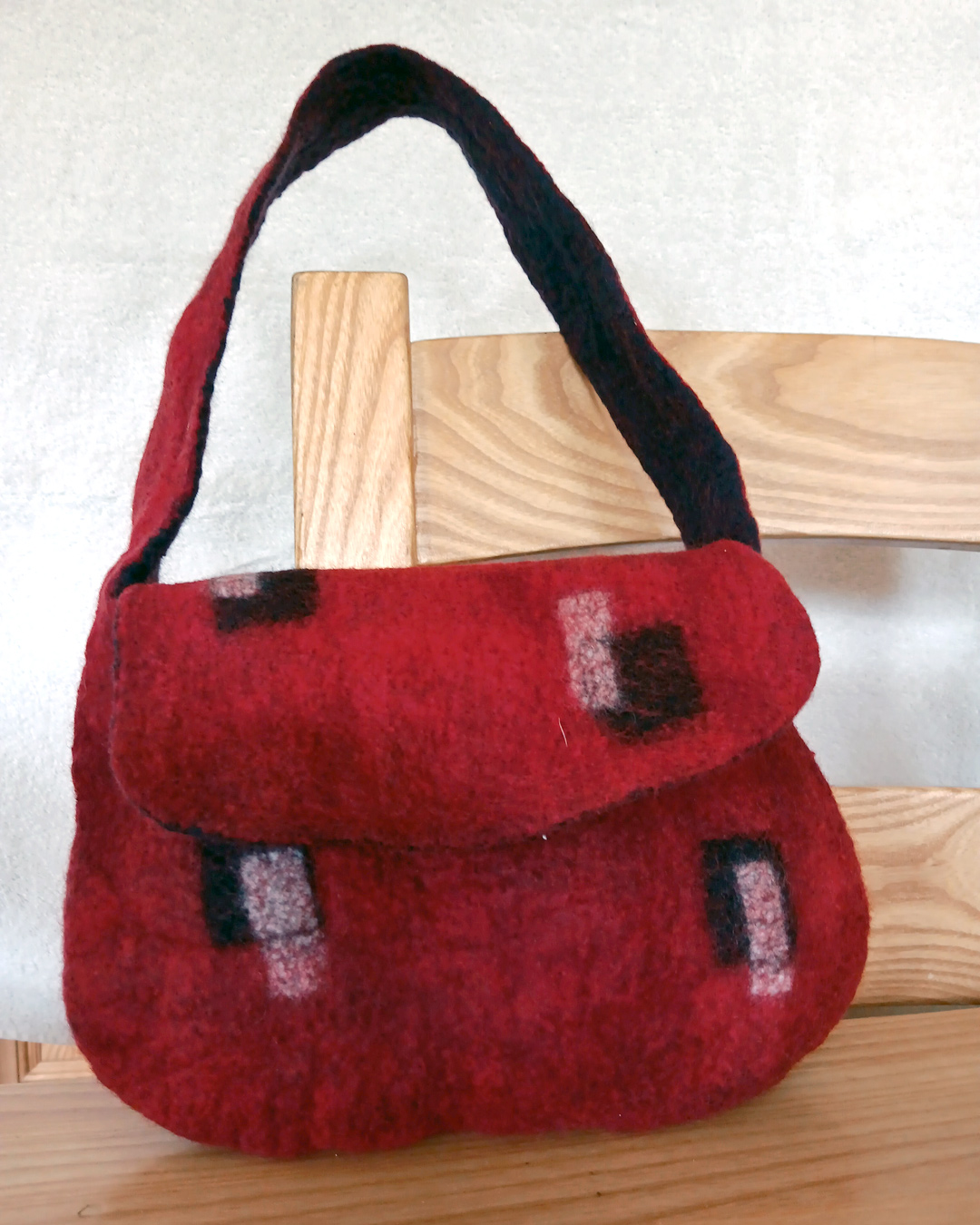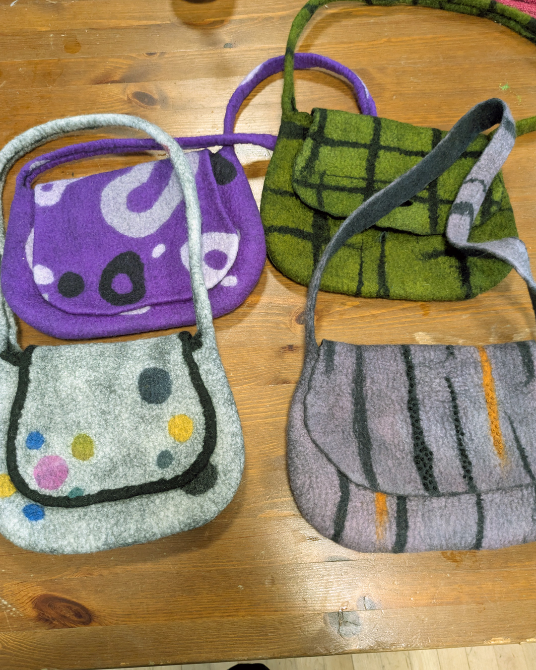 We had much to accomplish within one day—laying out fibre, rubbing, rolling, fulling, shaping, and transforming the wool roving into stylish, one-of-a-kind bags with a flap, strap, and pocket!