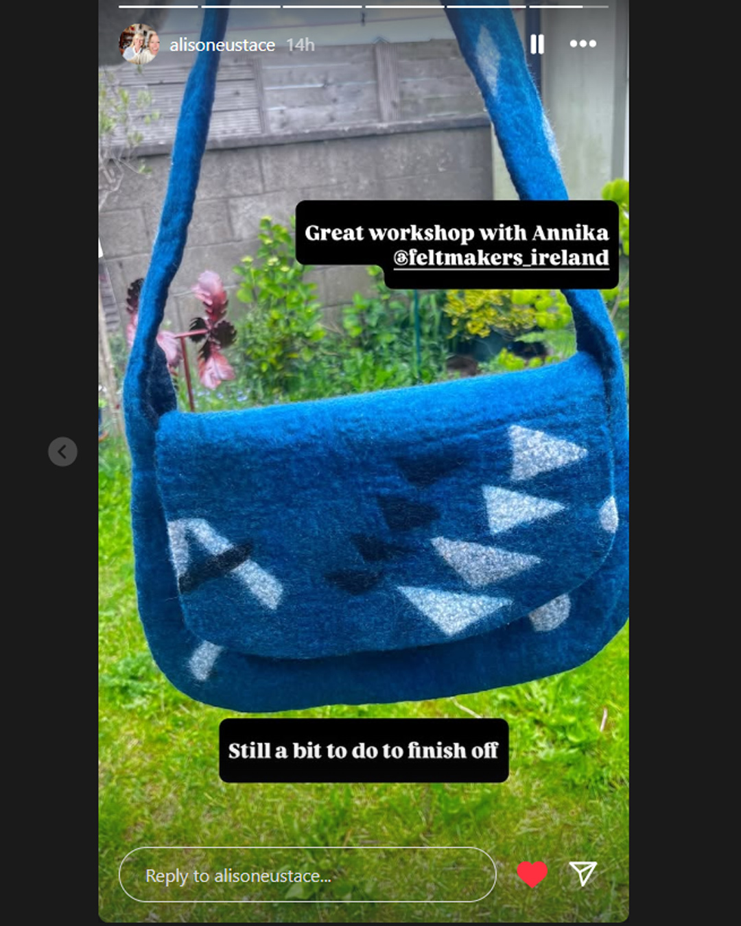 For those interested in learning more, Annika mentioned that the method of creating the bag’s clever handle was adapted from Mandy Nash‘s book, ‘Making Felt Bags’, which, while out of print, is nonetheless available via Dubray Books’ website – https://www.dubraybooks.ie/product/making-felt-bags-9781785008627