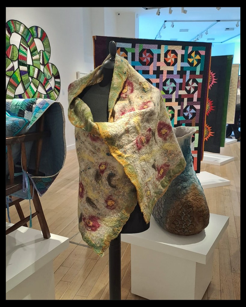 The turnout at the opening was great, and we all had the opportunity to see an amazing array of works by both feltmakers and quilters. Seeing the two types of crafts side by side was very illuminating; they represented very different ways of making, yet both featured intricate and fantastic work. As a feltmaker, I gained a deeper respect for the skill and patience required to create the quilted artworks on display.