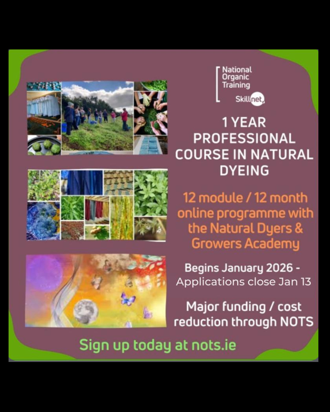 For individuals living outside of Ireland, visit the Natural Dyers Academy‘s website – https://appleoakfibreworks.com/collections/1-year-professional-natural-dyeing-programme-build-your-portfolio/products/mastering-natural-colour-professional-natural-dyeing-course-2026