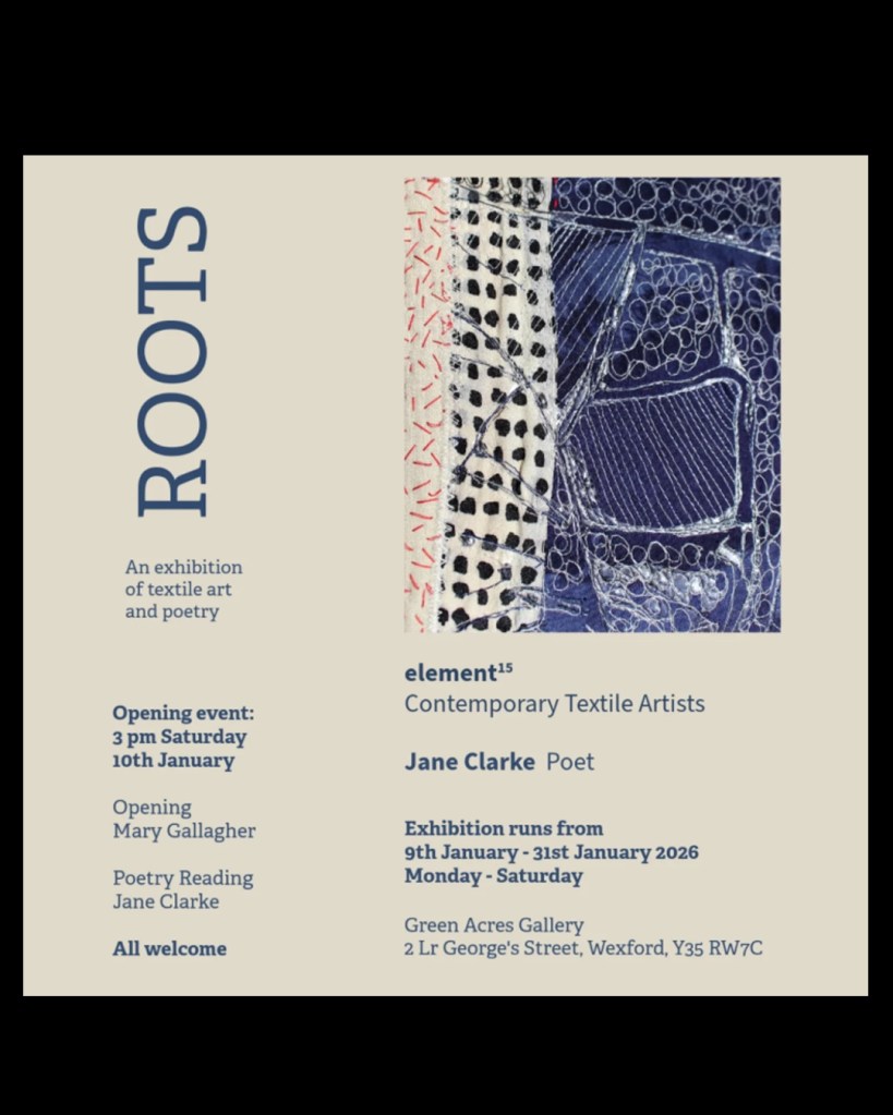 Textile group Element15‘s ‘ROOTS: An Exhibition of Textile Art and Poetry’ is now showing at Green Acres Gallery, Co Wexford.