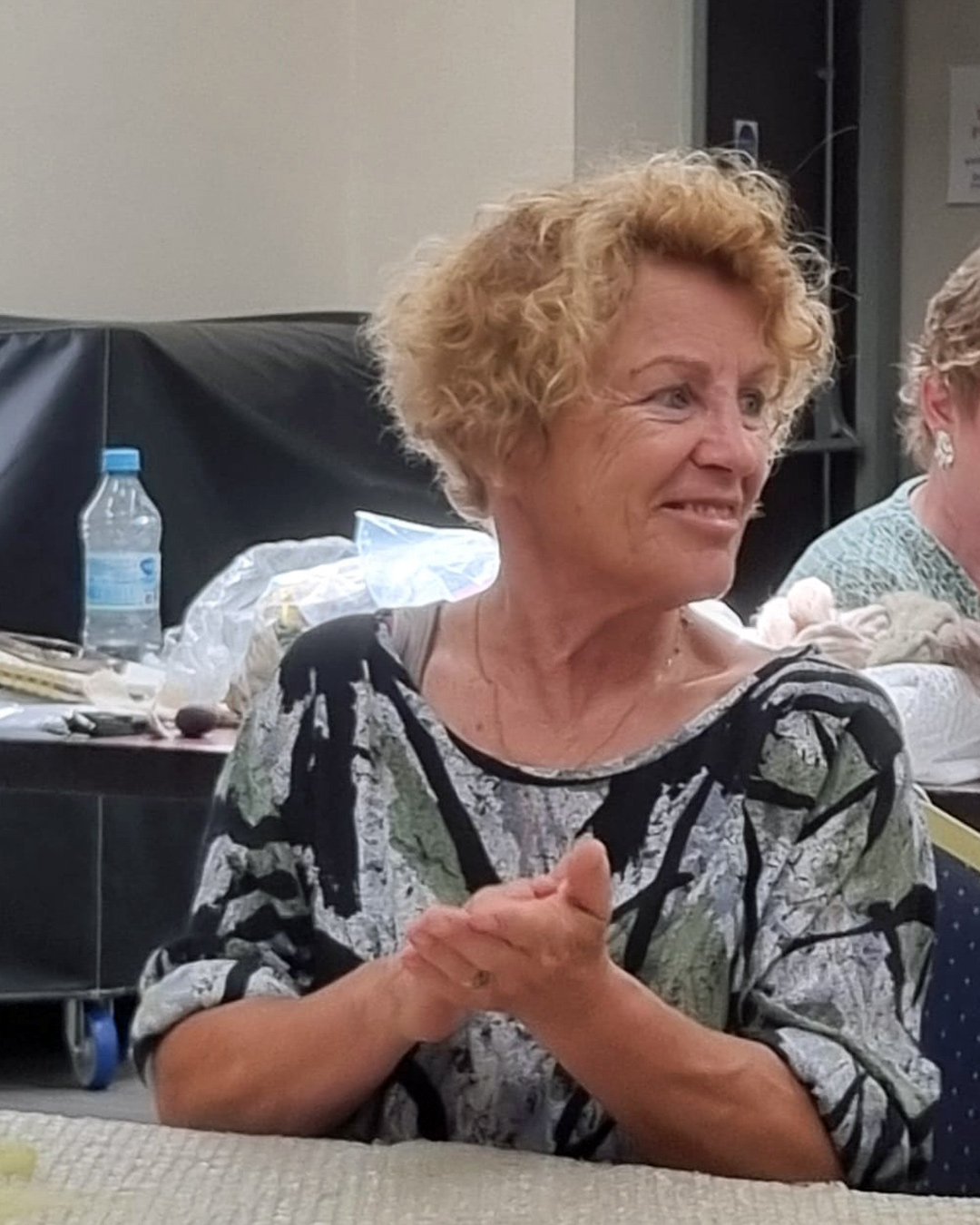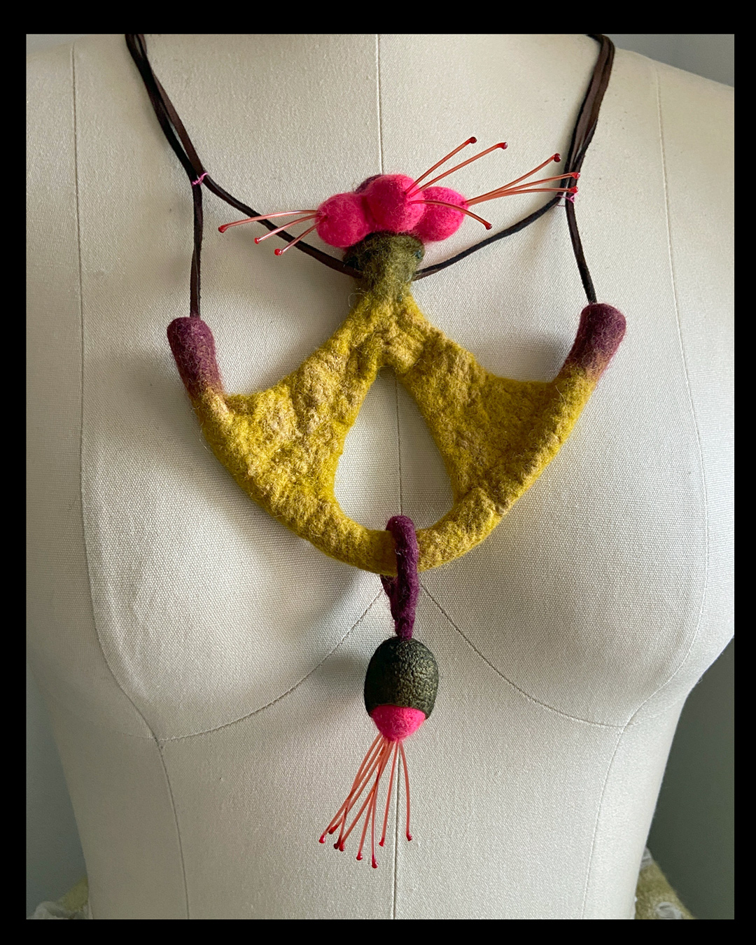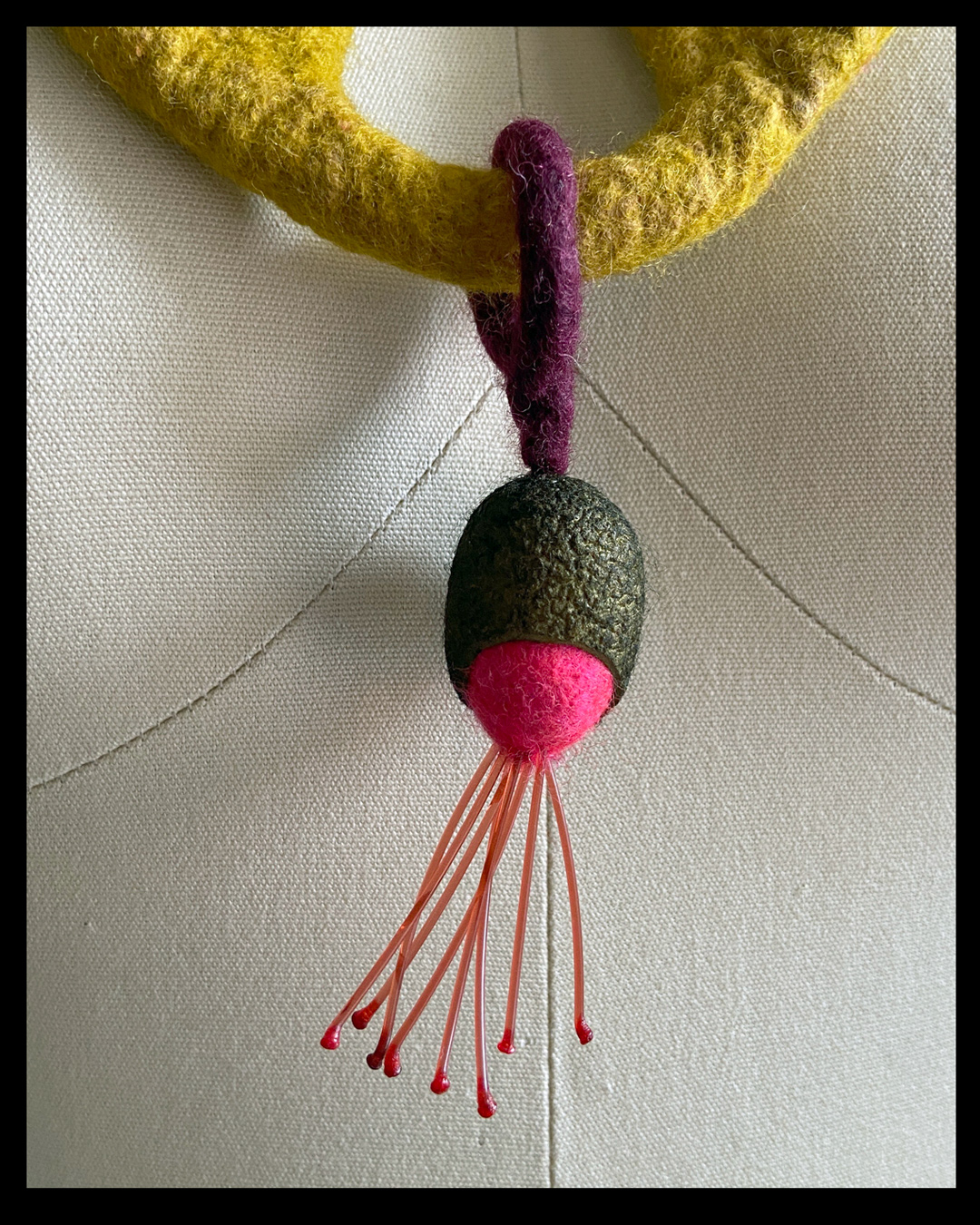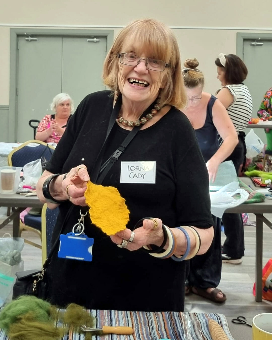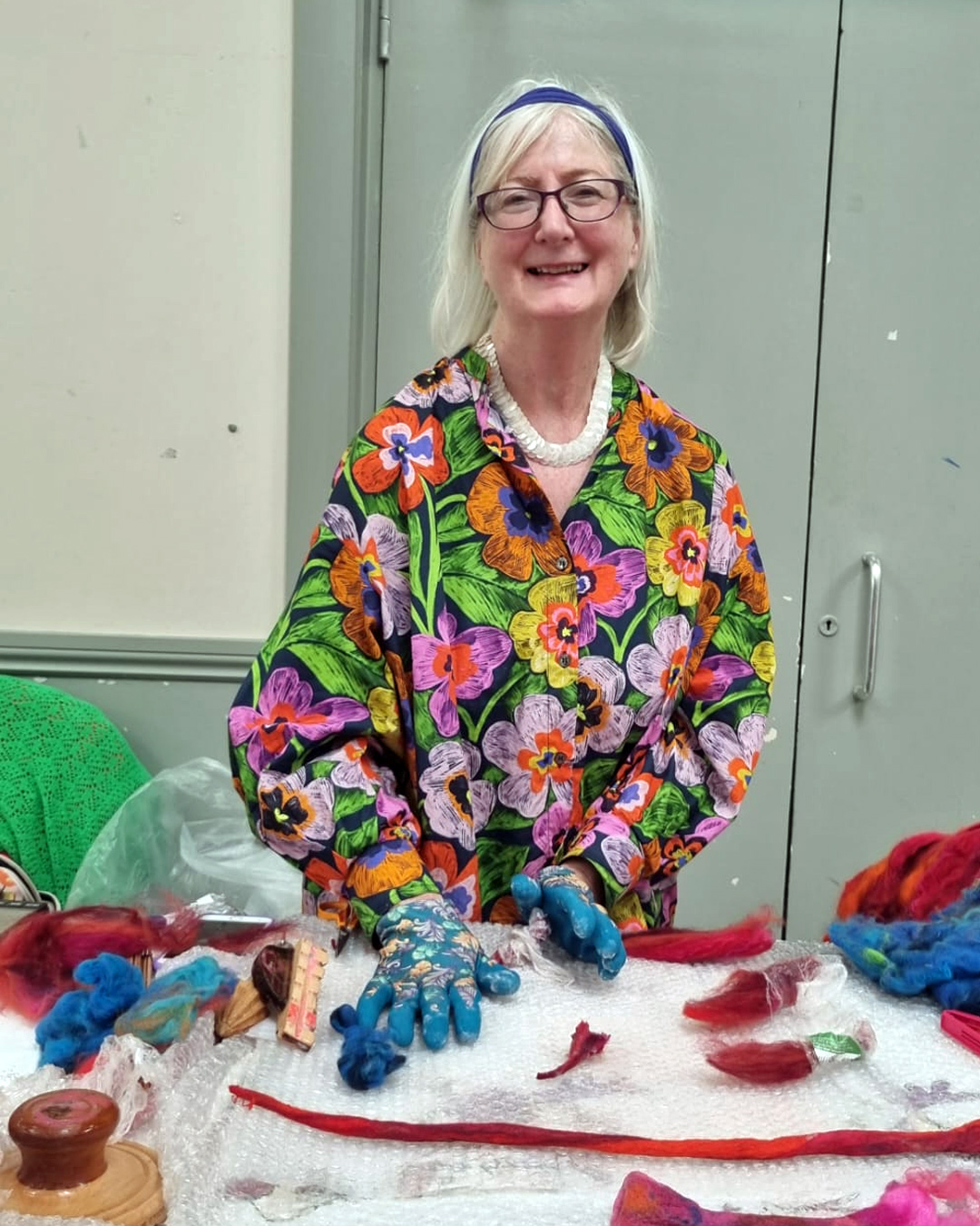 Pam de Groot is an Australian textile artist celebrated for her innovative approach to three-dimensional felting. With a deep passion for transforming raw fibres into intricate, wearable sculptures, Pam’s work blends traditional techniques with contemporary flair. Her creations often feature bold textures, vibrant colours, and unexpected materials, pushing the boundaries of what felt can achieve. During the workshop, her warm and engaging teaching style shone through, making complex techniques accessible and exciting for all skill levels.