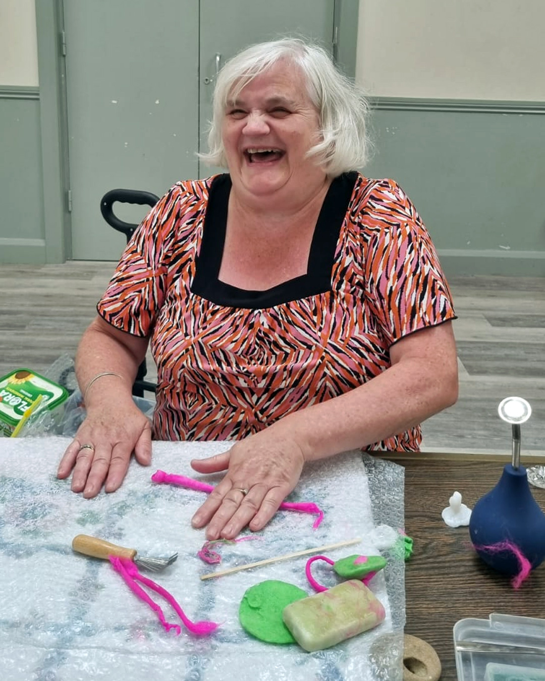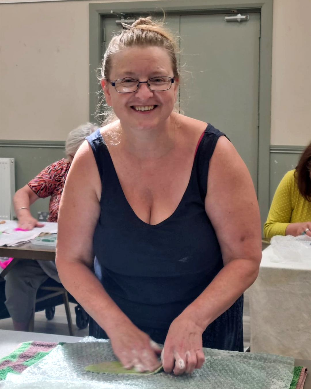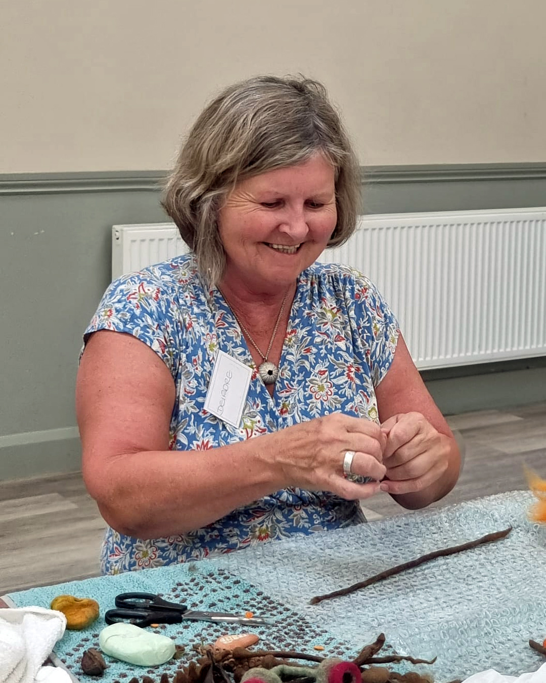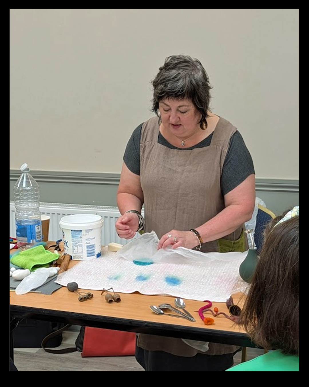 Pam demonstrating. In the foreground are sample pieces of felted jewellery that she has created.