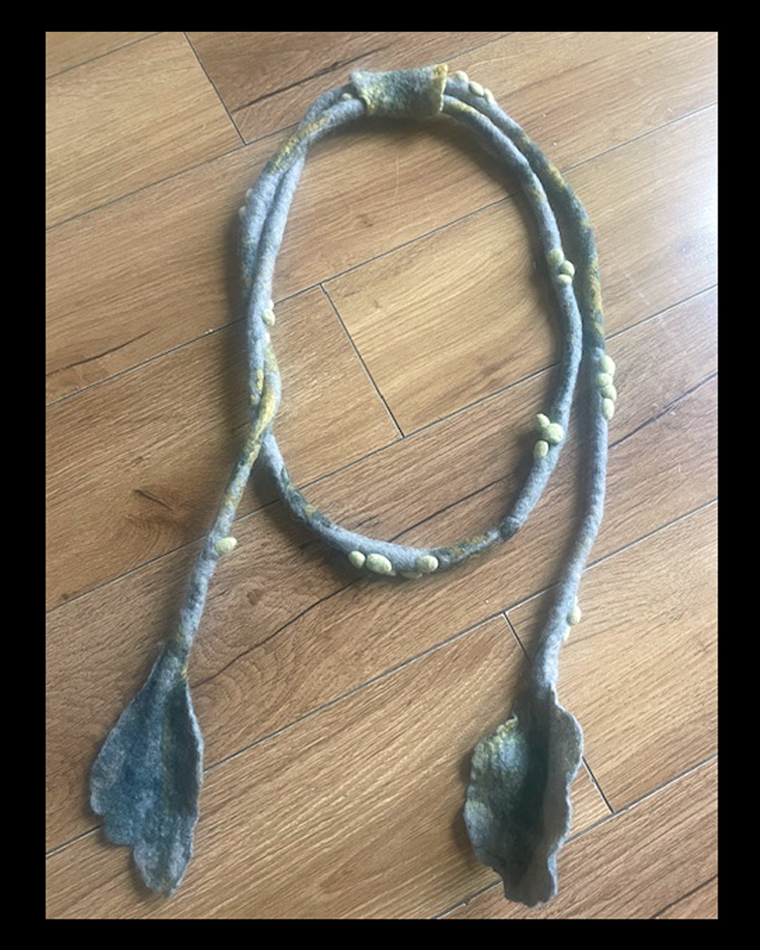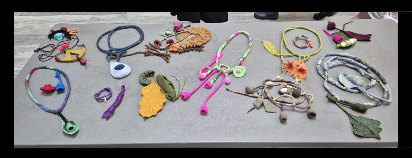After mastering the techniques, participants delved into designing their own wearable pieces, incorporating a rich array of materials, including soft Merino wool, shimmering silk fibres, textured silk cloth, hearty Irish wool, delicate silk pods, stones, and other textiles. The diversity of materials sparked endless creativity, resulting in an inspiring collection of necklaces, brooches, and other adornments, each piece as unique as its creator.