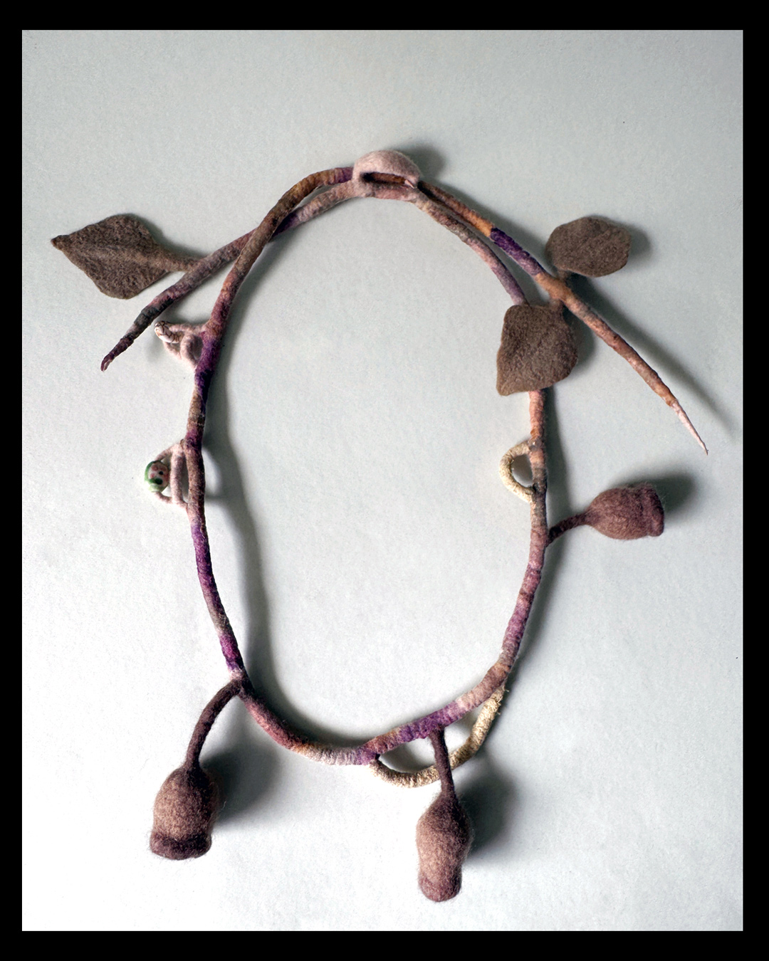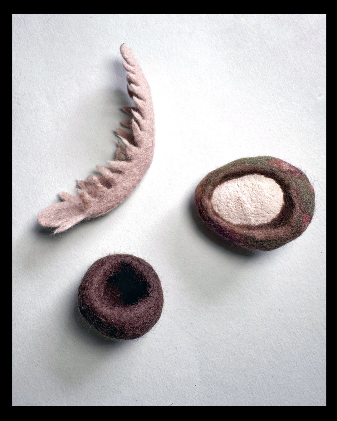 The first one is by Feltmakers Ireland member Hélène Dooley, who has written an article about her experiments with natural dyeing, using tea, pine cones, and the roots and bark of a plum tree. Of special interest is her experiment with felting WITHOUT soap! Instead, she used vinegar.