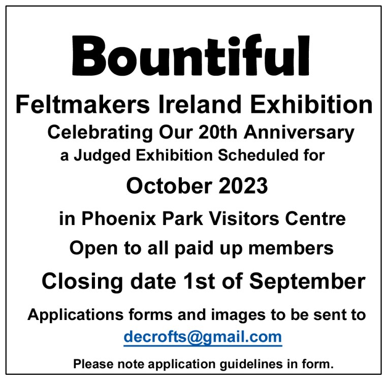 Applications are now open to Feltmakers Ireland AND Feltmakers North members for our annual juried exhibition in the Phoenix Park Visitors’ Centre. This will be an All Ireland exhibition.