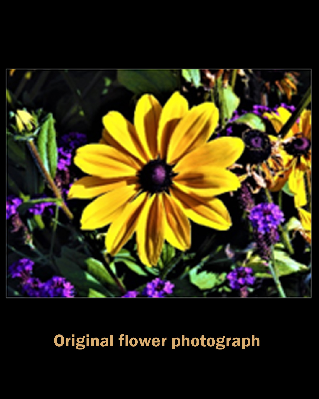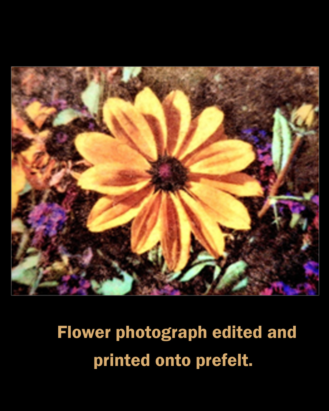 Next, I worked with a flower photograph that I edited in Photoshop, ready to print and transfer onto extra-fine prefelt. I wanted to see how clear I could get this image from a photograph printed onto paper and then transferred onto felt. I hoped this image would pick up the shadows and colours that I liked about the original picture. It was interesting to see the printed results when transferred onto felt.