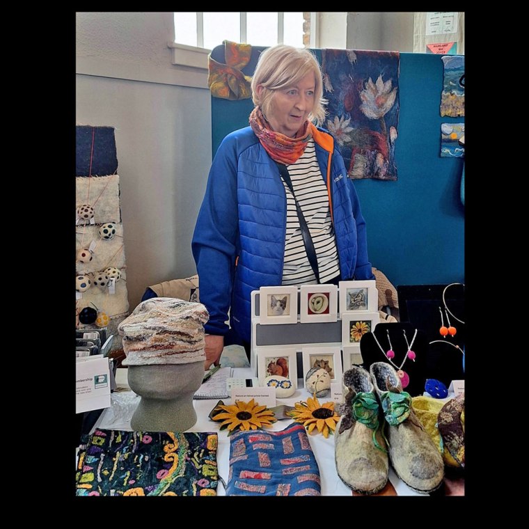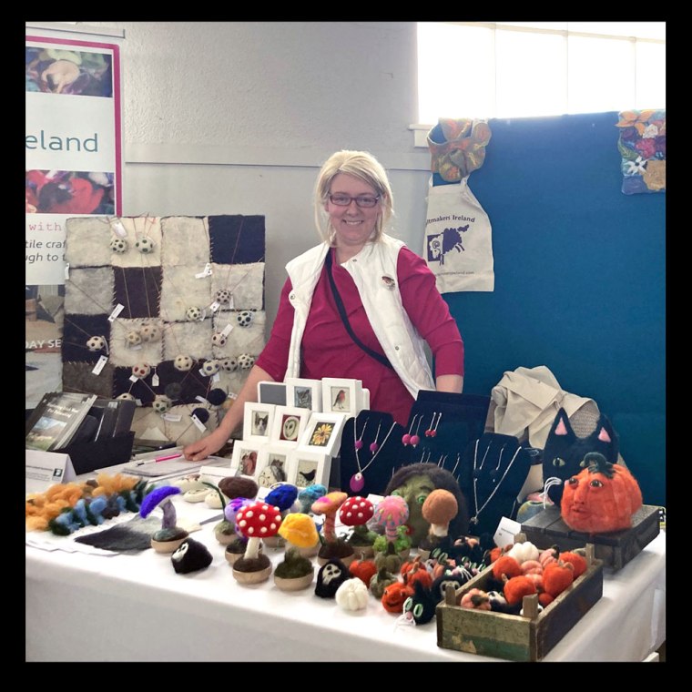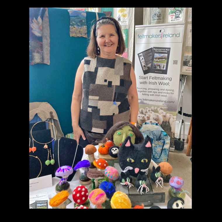 A special highlight was the chance to promote our beautiful book, ‘Exploring Irish Wool for Feltmaking’. Copies were available for sale alongside an array of handmade treasures: wet-felted vessels, pocket books and bags, bookmarks, greeting cards, whimsical wool pumpkins, and gnomes—every single piece made exclusively with Irish wool from a rainbow of native sheep breeds.