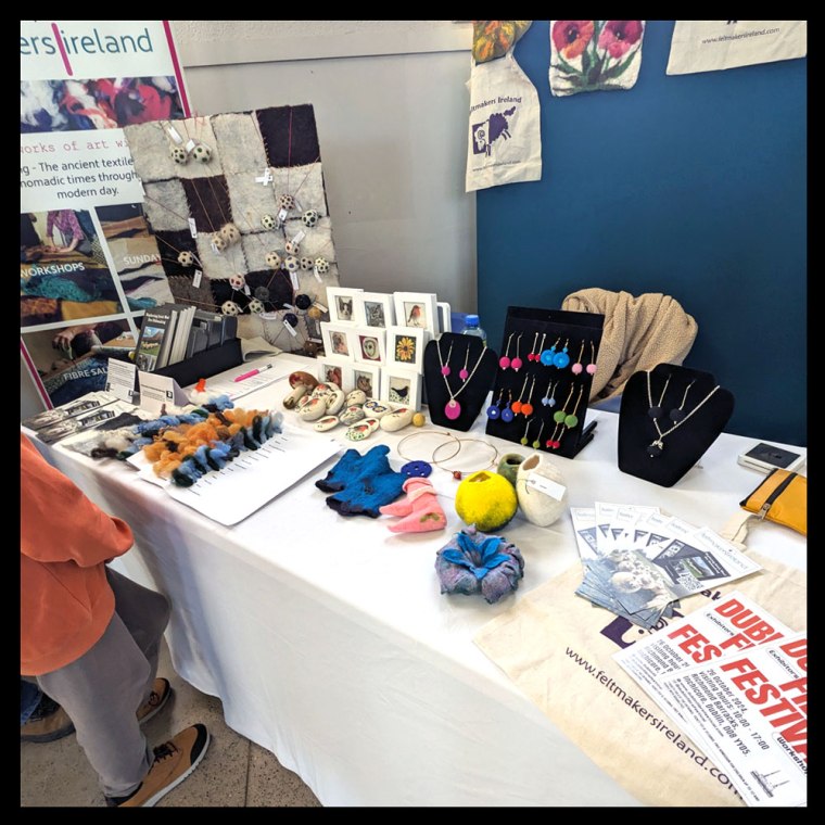 At the Textile Market, volunteers from Feltmakers Ireland set up a lively demonstration station where visitors could watch both wet felting and needle felting techniques. We talked passionately about the guild’s mission to keep traditional feltmaking skills alive, to celebrate Irish wool in all its glorious variety, and to foster creativity and community through this extraordinarily versatile material.