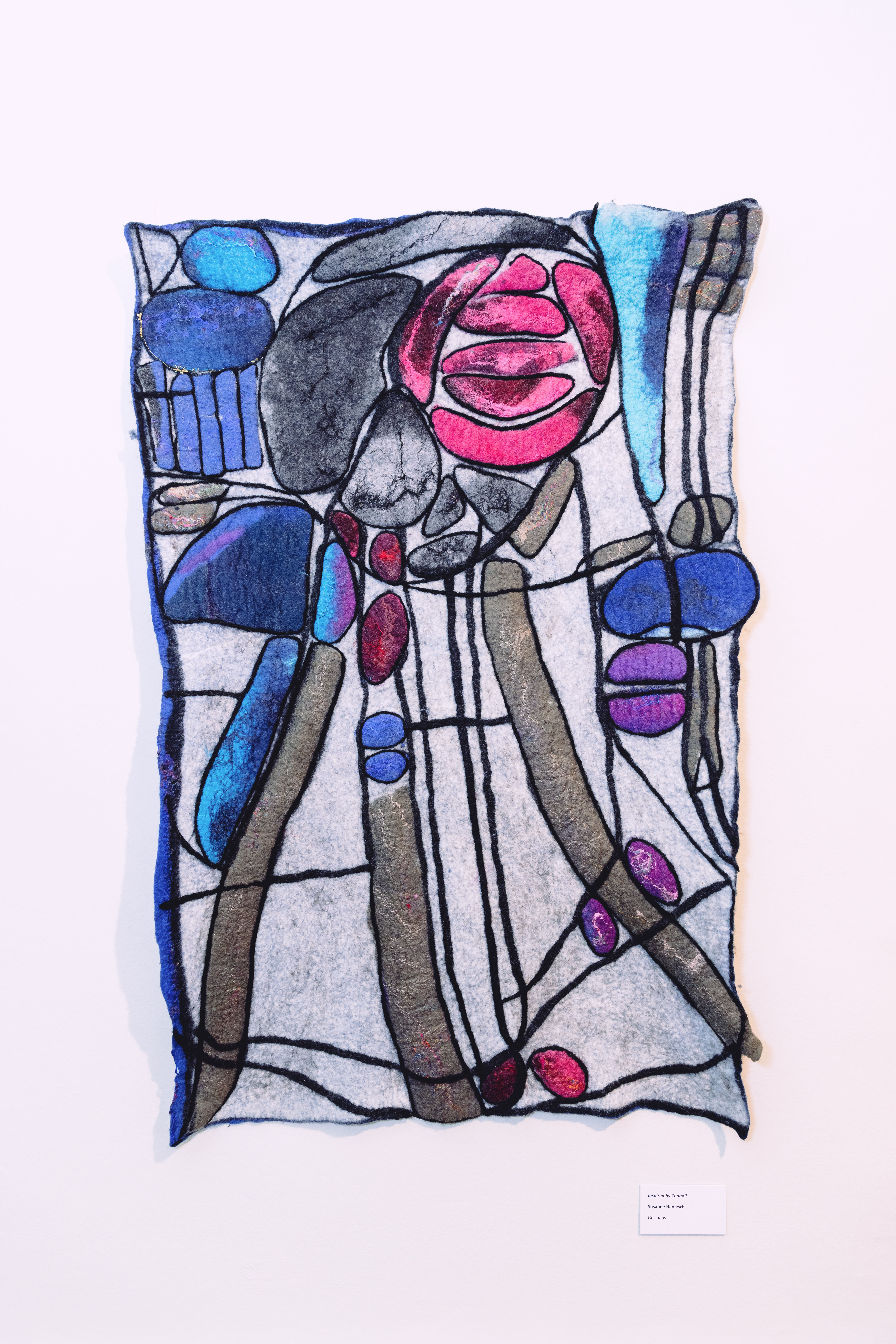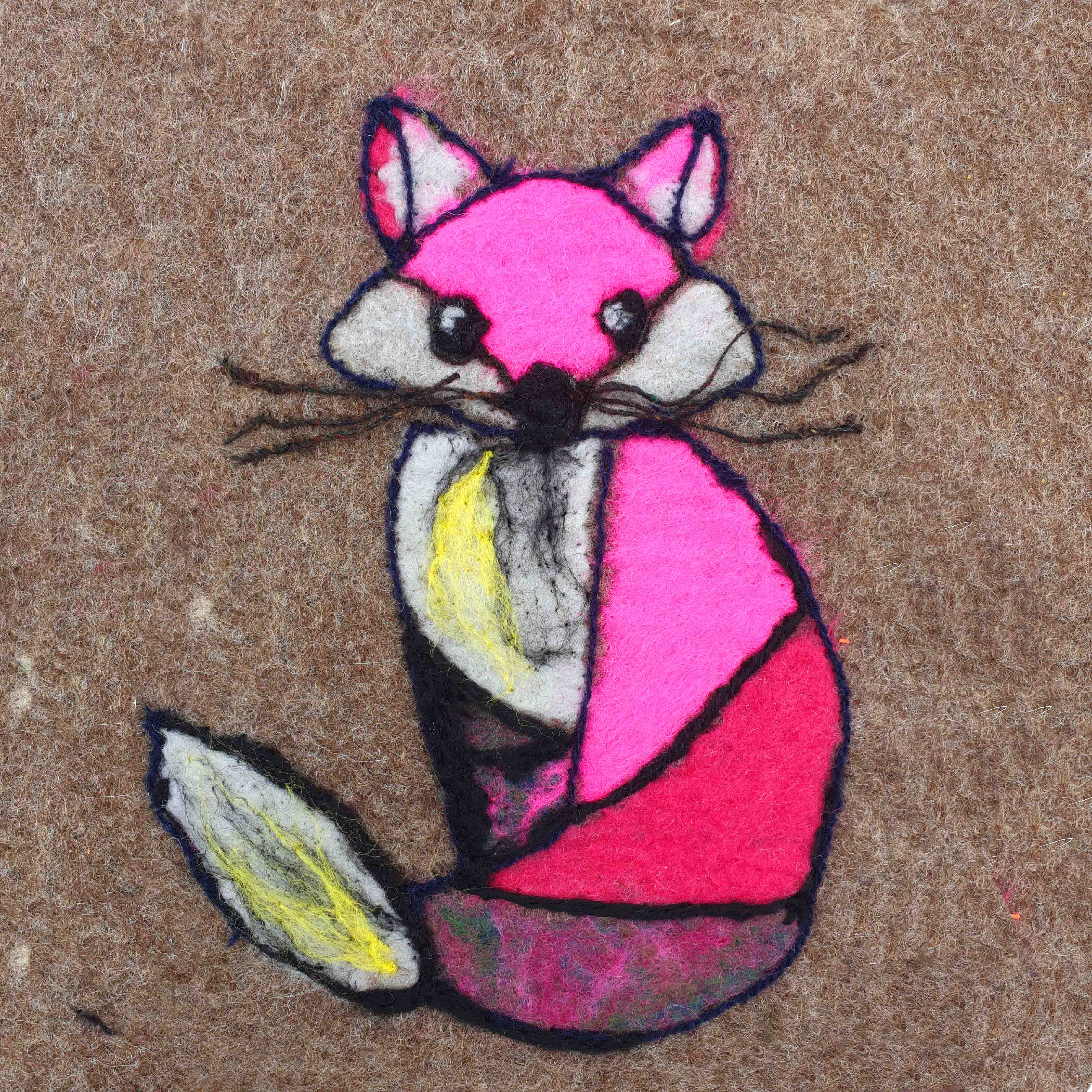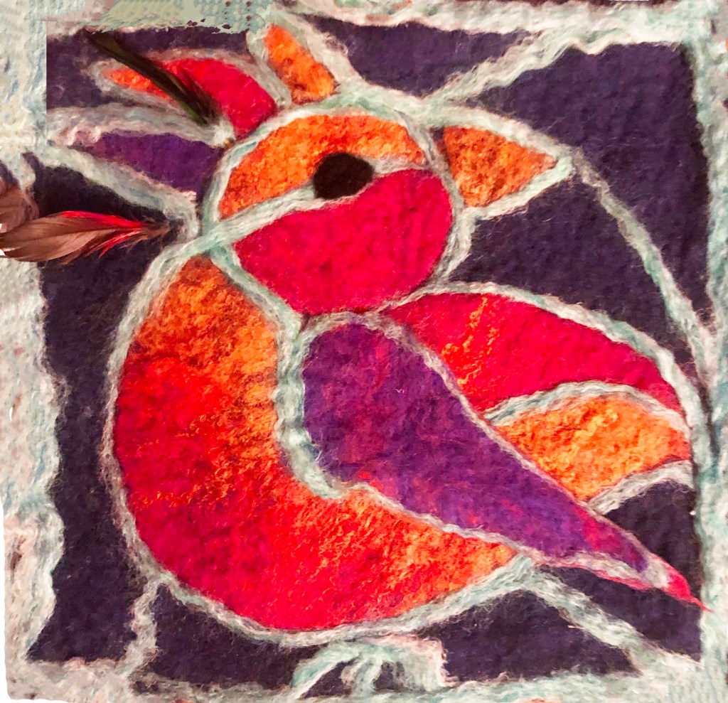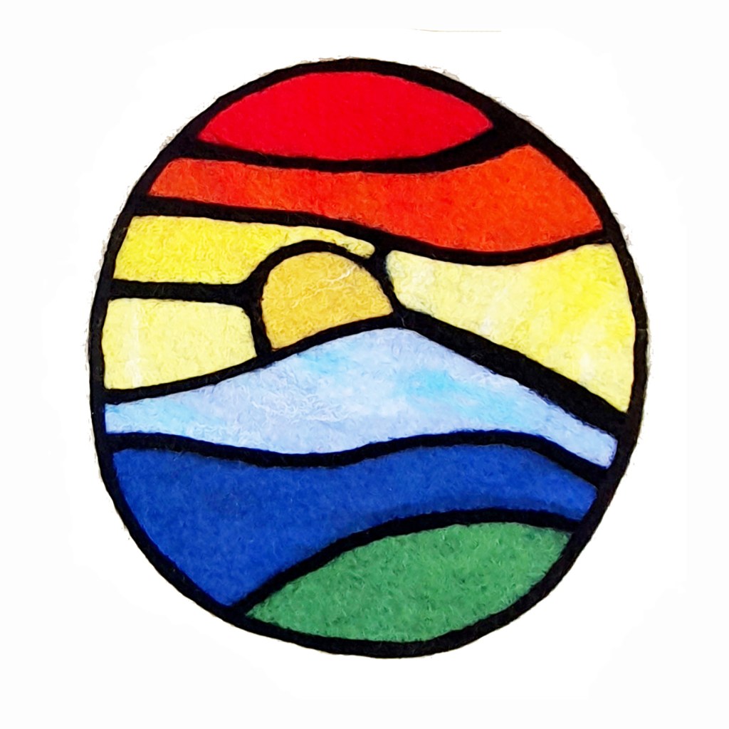 The stained glass method involved needle-felting a narrow black border of Merino roving around each coloured field or letter, which gave the shapes a crisp outline and improved legibility. By the end of the process, each participant had created a unique felted name tag, decorated with colour, texture, and clear lettering.