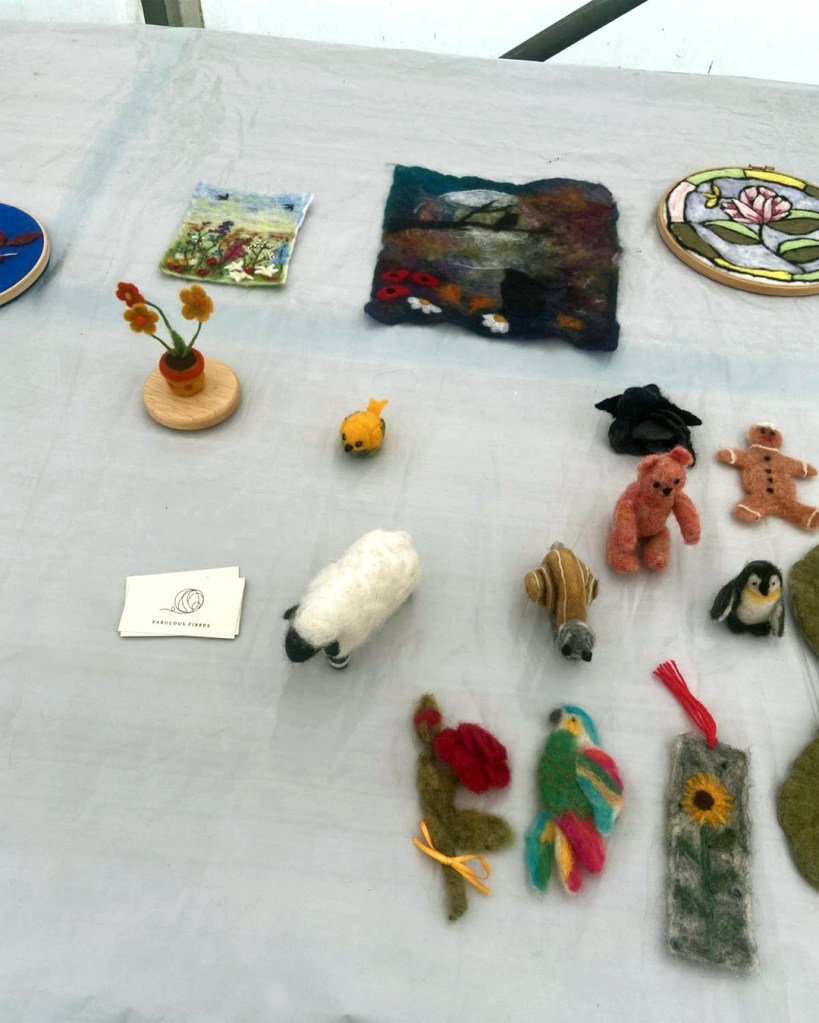 Visitors loved getting hands-on: touching fleece samples from rare and heritage breeds, feeling the different textures, and discovering how dramatically each type of wool felts. Our display of members’ artwork—landscape wall pieces, sculptures and wearable art—showed just how far this simple fibre can be pushed in skilled and imaginative hands.
