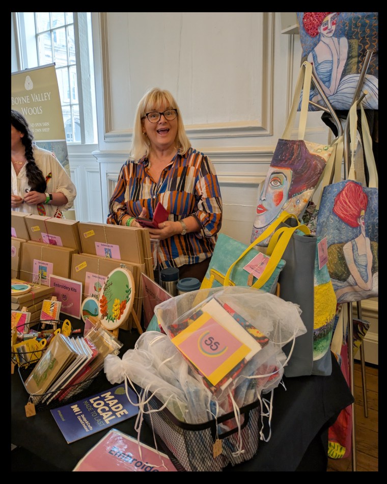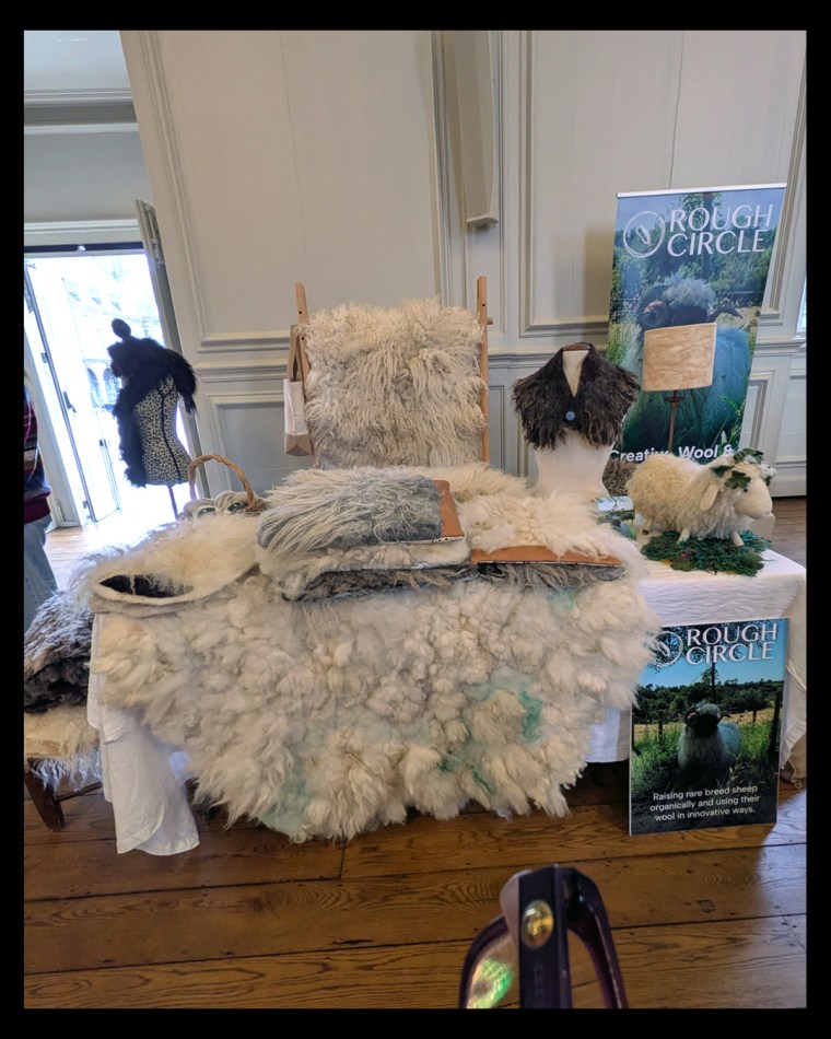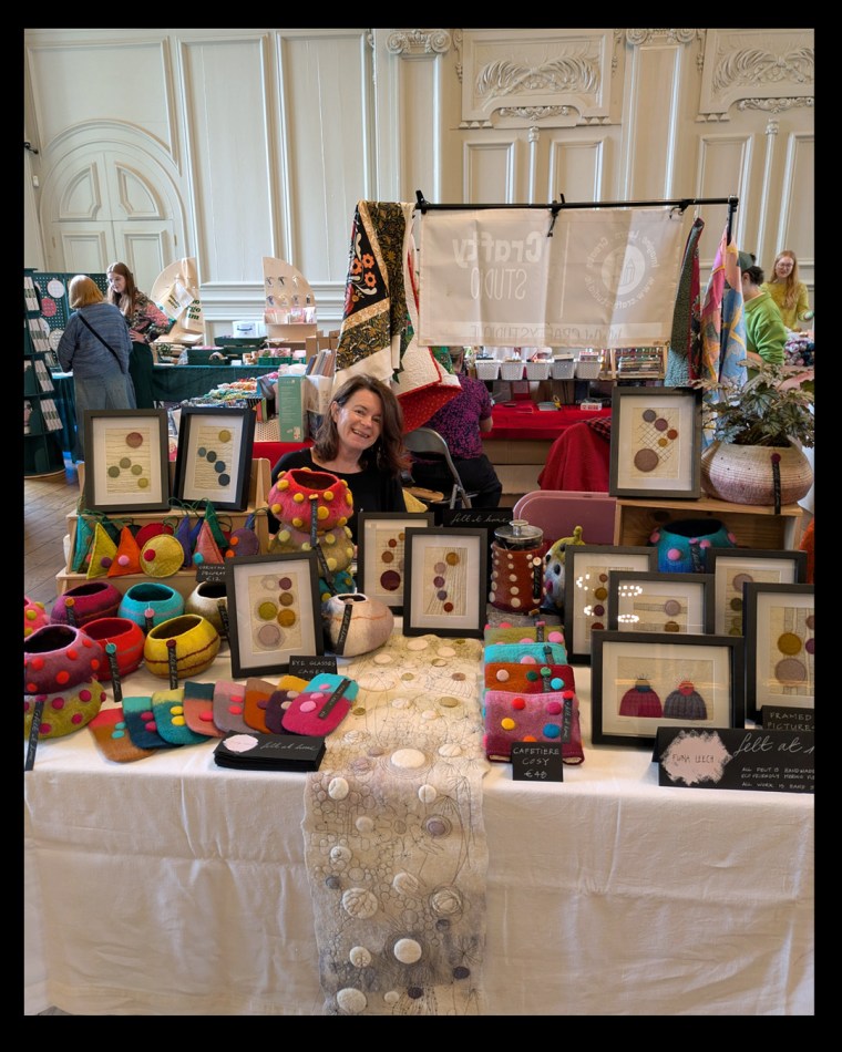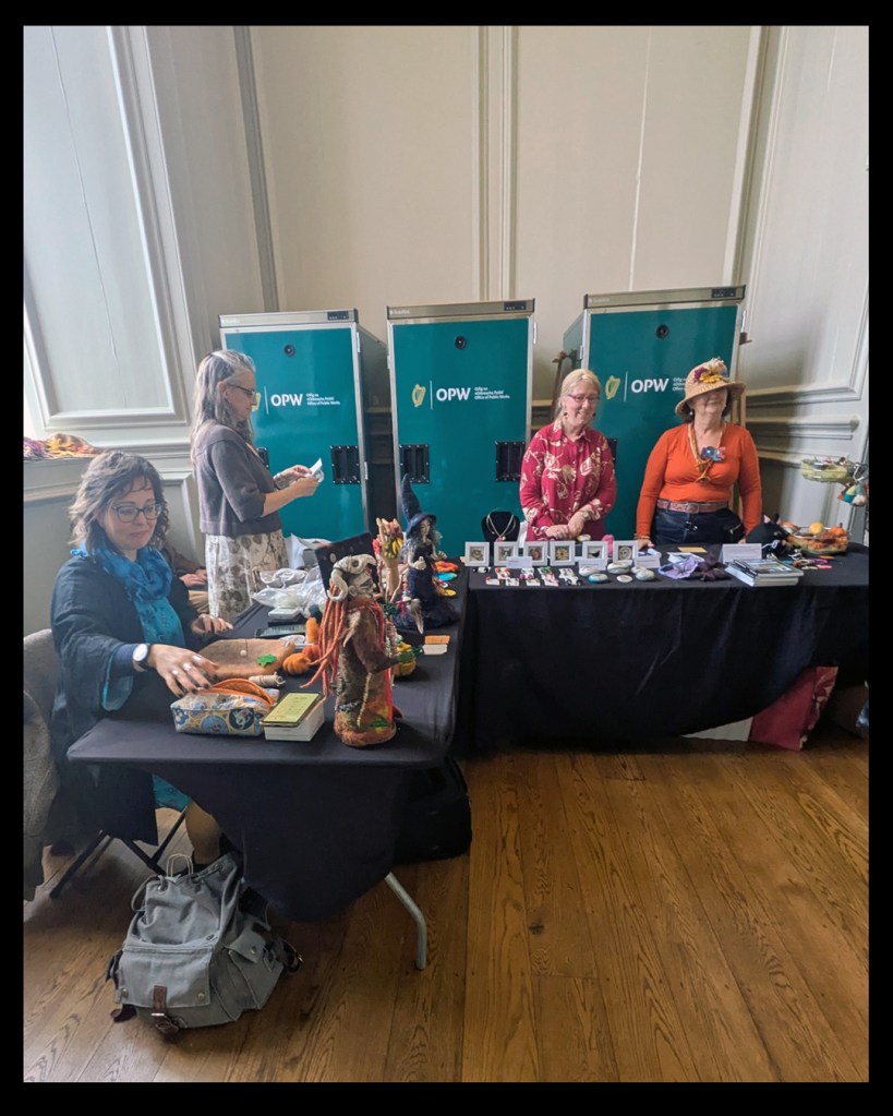 A special highlight was the chance to promote our beautiful book, ‘Exploring Irish Wool for Feltmaking’. Copies were available for sale alongside an array of handmade treasures: wet-felted vessels, pocket books and bags, bookmarks, greeting cards, whimsical wool pumpkins, and gnomes—every single piece made exclusively with Irish wool from a rainbow of native sheep breeds.