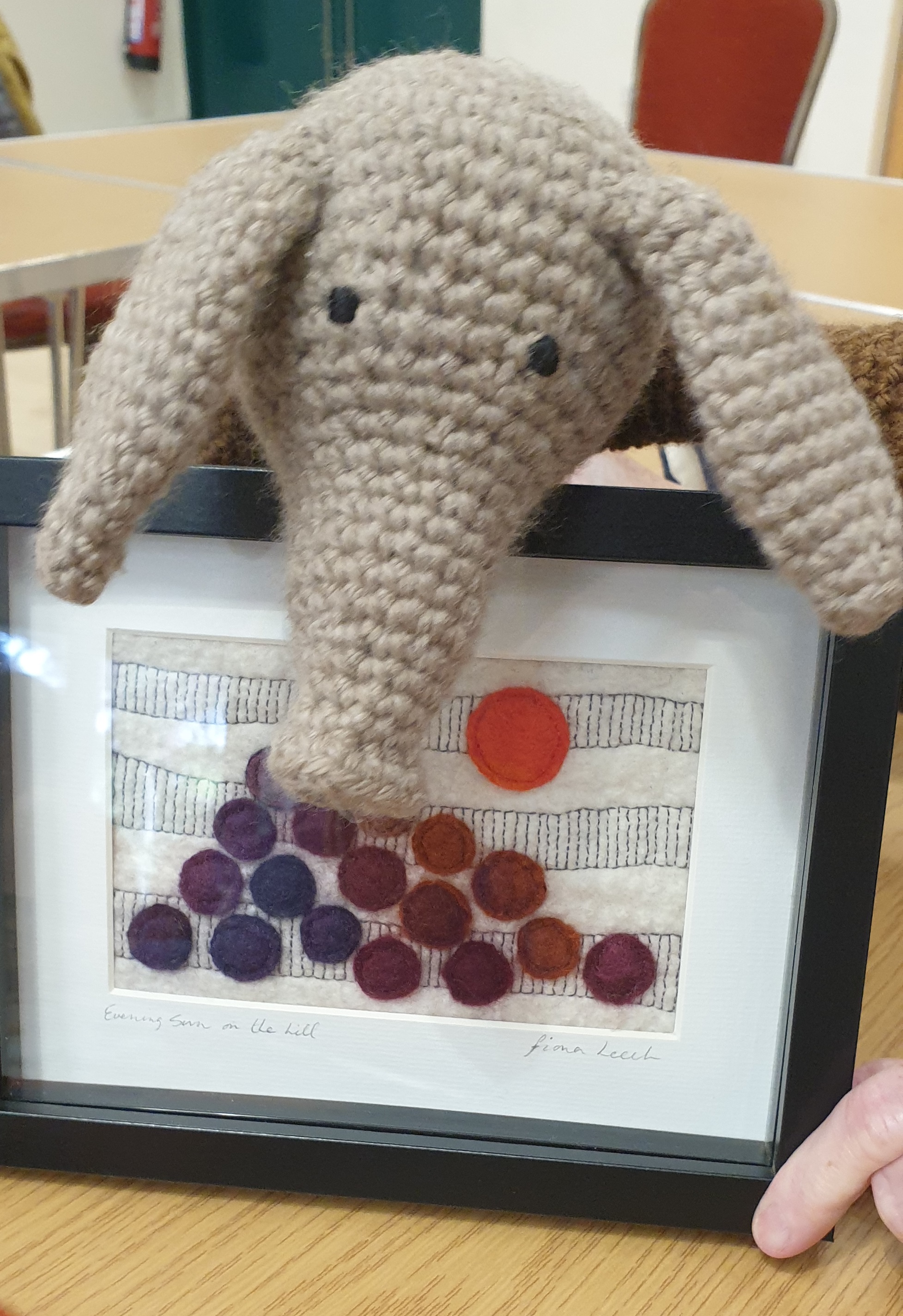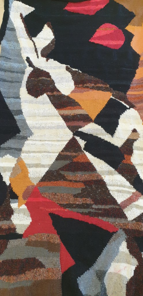 Fiona gave us an inspiring insight into her early career with lots of samples for us to touch and feel as well as notebooks where she developed ideas. We viewed an early hand-knitted wall panel of a Henri Matisse lady – all done with scraps of wool and NO PATTERN.