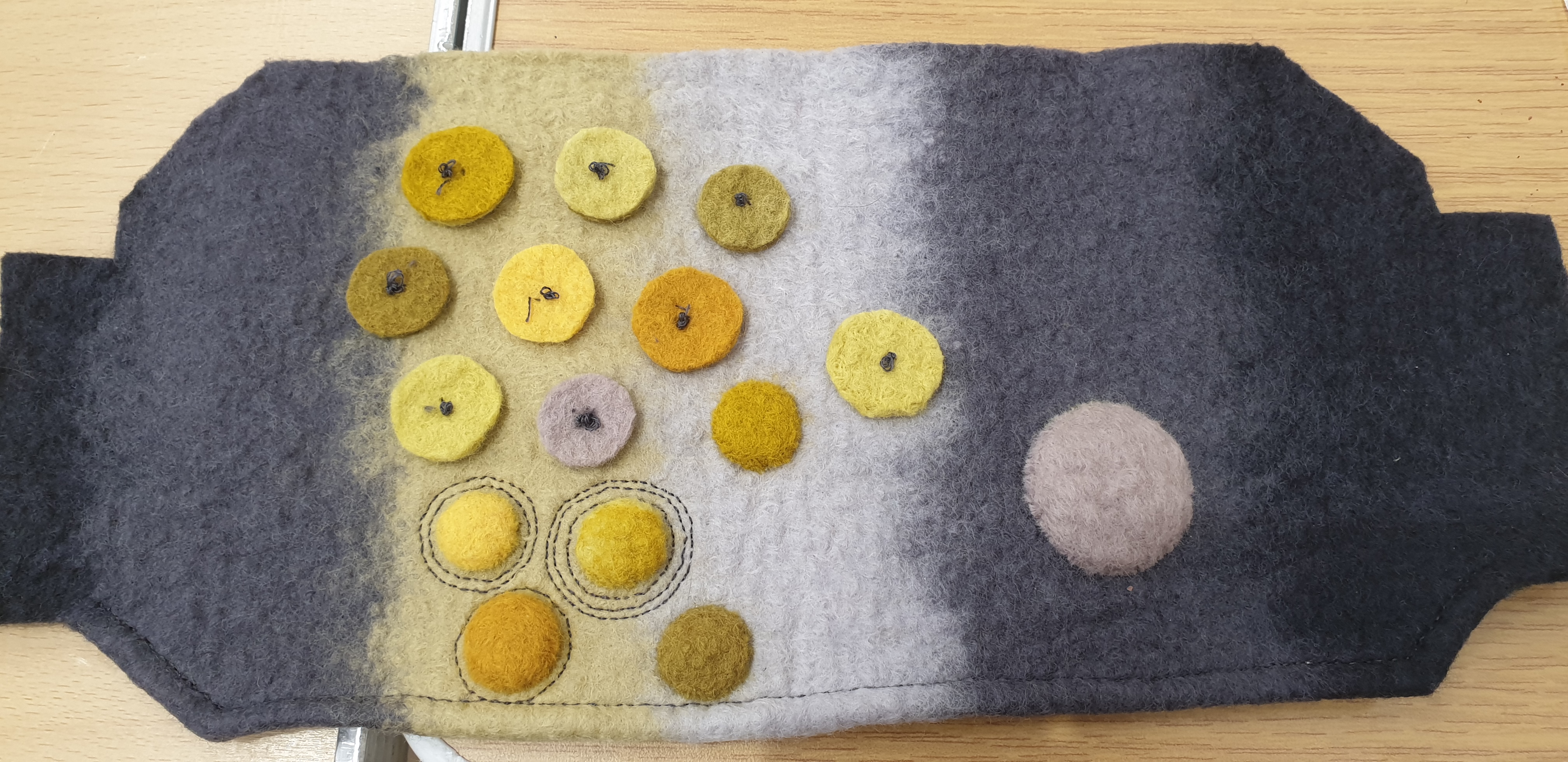 The materials used in my piece are fully sustainable. I have used repurposed glass bottles to contain sand ( from Irish beaches… also the component for making glass). The felt tops are 100% wool, from sheep, a fully sustainable, and biodegradable material and the fibre attaching each bottle is linen, plant based, water consumption friendly material.