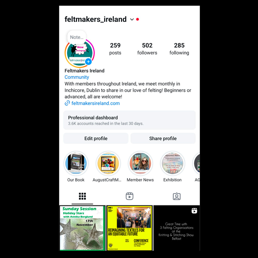 Our former Instagram was @feltmakersireland, and we had over 1,000 followers. However, due to circumstances beyond our control, we did not have proper access to the backend, so we could not share Members News on our Stories or access any direct messages (DMs) sent to the account.