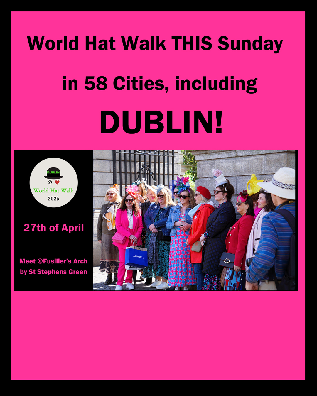 Our event in Dublin is part of the larger World Hat Walk, organised by London Hat Week, which celebrated its 10th anniversary in 2024. Of course, the grandmomma of all Hat Walks is the Passejada amb Barret – Barcelona Hat Stroll, which celebrated its 20th anniversary on the same day! (Do check out their photos – such wild hats!)