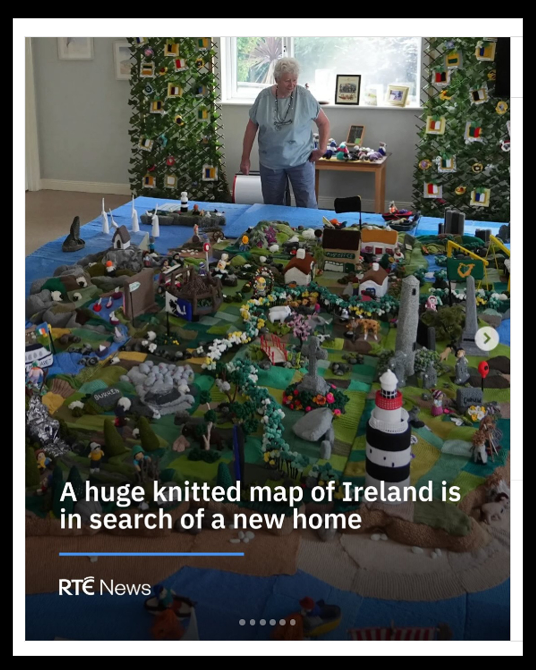 If you missed seeing the map on display at Gifted at the RDS, it can be viewed in person at Carnew Community Care in Carnew, Co Wicklow. For more information, visit this website – https://visitwicklow.ie/listing/knitted-map-of-ireland-carnew-community-care/