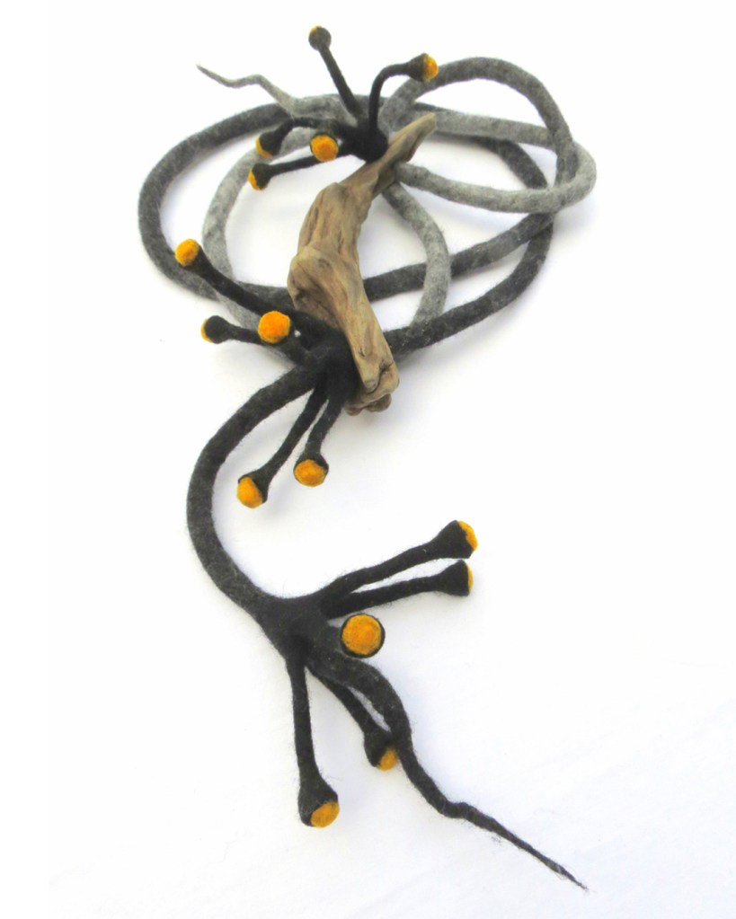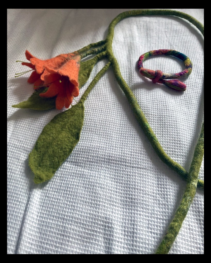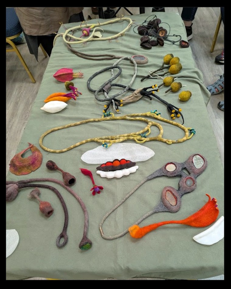 After mastering the techniques, participants delved into designing their own wearable pieces, incorporating a rich array of materials, including soft Merino wool, shimmering silk fibres, textured silk cloth, hearty Irish wool, delicate silk pods, stones, and other textiles. The diversity of materials sparked endless creativity, resulting in an inspiring collection of necklaces, brooches, and other adornments, each piece as unique as its creator.