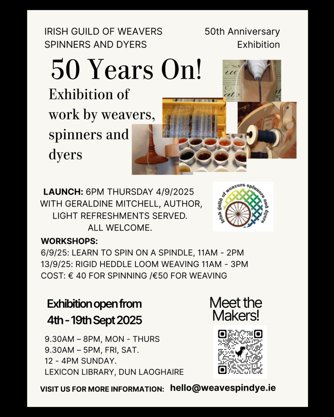 Meanwhile, in Dun Laoghaire, the Irish Guild of Weavers, Spinners, and Dyers (IGWSD) is marking its 50th anniversary with a special exhibition at the dlr Lexicon Library. Showcasing the craft traditions of weaving, spinning, and dyeing, the exhibition highlights both heritage techniques and contemporary textile art.