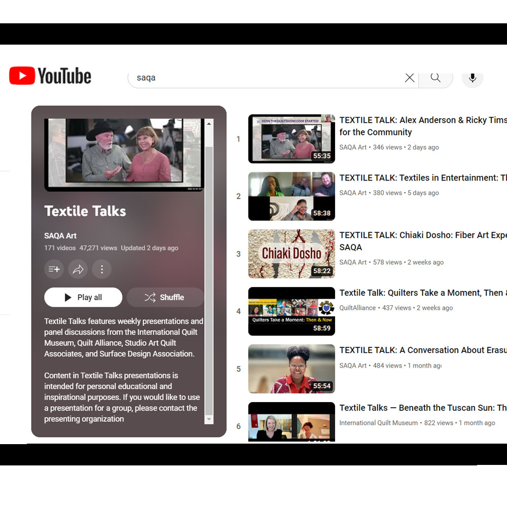 Textile Talks features weekly presentations and panel discussions from the International Quilt Museum, Quilt Alliance, Studio Art Quilt Associates, and Surface Design Association.