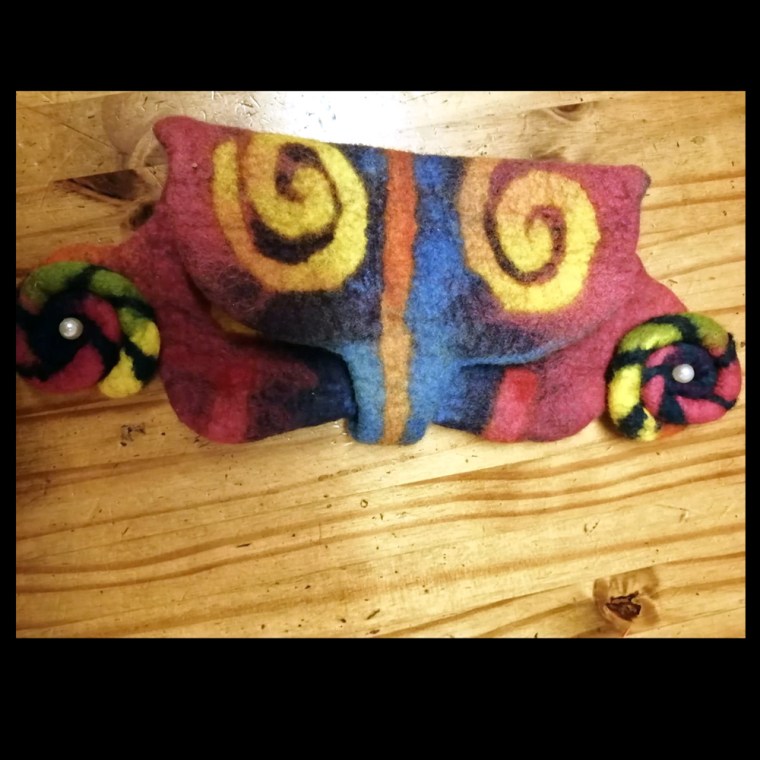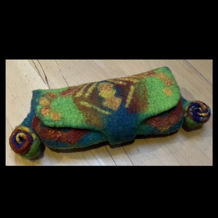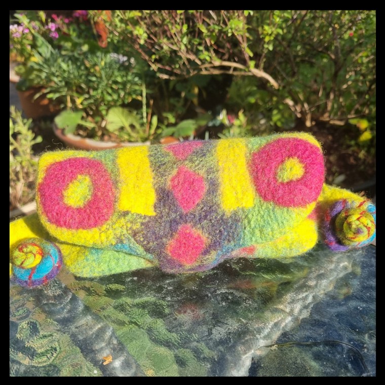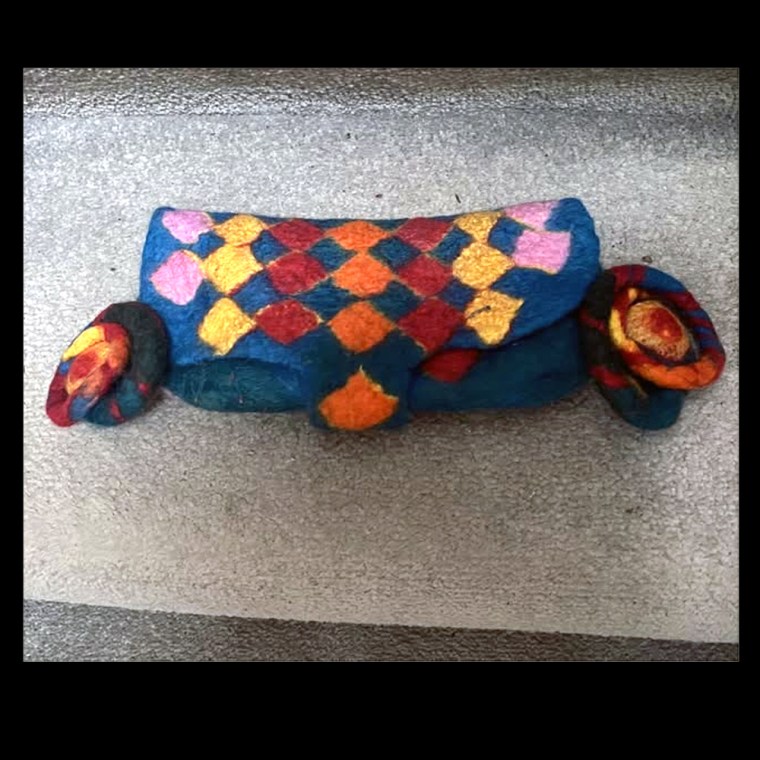 On October 6, 2024, eighteen members of Feltmakers Ireland came together at the CIE Sports Hall in Inchicore, Dublin, for an innovative hybrid workshop. Taught remotely by renowned Hungarian artist and tutor Judit Pรณcs via Zoom, this innovative course blended the advantages of group learning with international expertise. The project, a wet-felted eyeglass case with intricate embellishment options, challenged participants to develop their advanced felting skills.